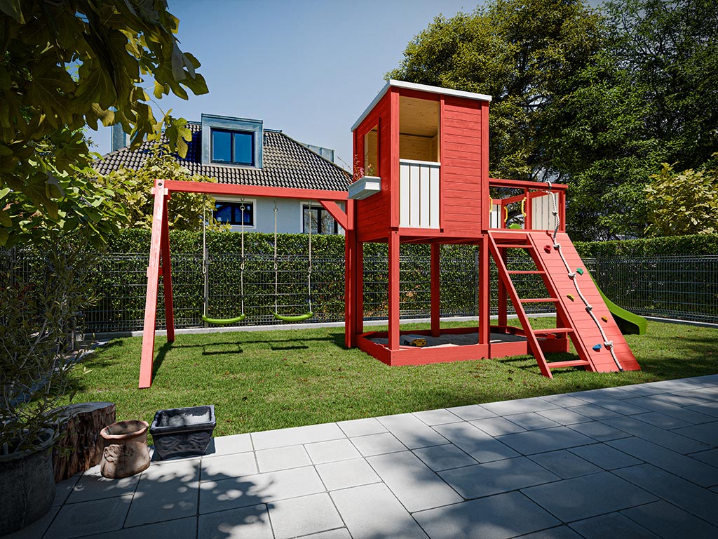Cette aire de jeu est fabriquée en bois, un matériau naturel idéal pour les équipements de jeu pour enfants : résistant et durable. Du bois d’épicéa de première qualité a été utilisé pour sa fabrication. L’épicéa est particulièrement robuste et durable, ce qui garantit la stabilité nécessaire. Le bois est brut et non traité, exempt de toute imprégnation chimique et absolument sans danger. Pour assurer la durabilité et la résistance aux intempéries du bois, nous recommandons un traitement avec un produit de protection du bois, comme un vernis ou une lasure. Le bois brut est également parfait pour une peinture colorée et personnalisée.