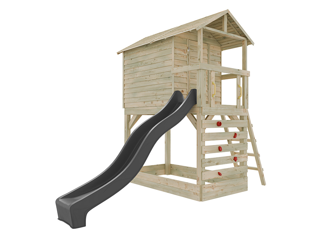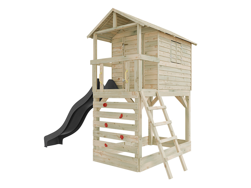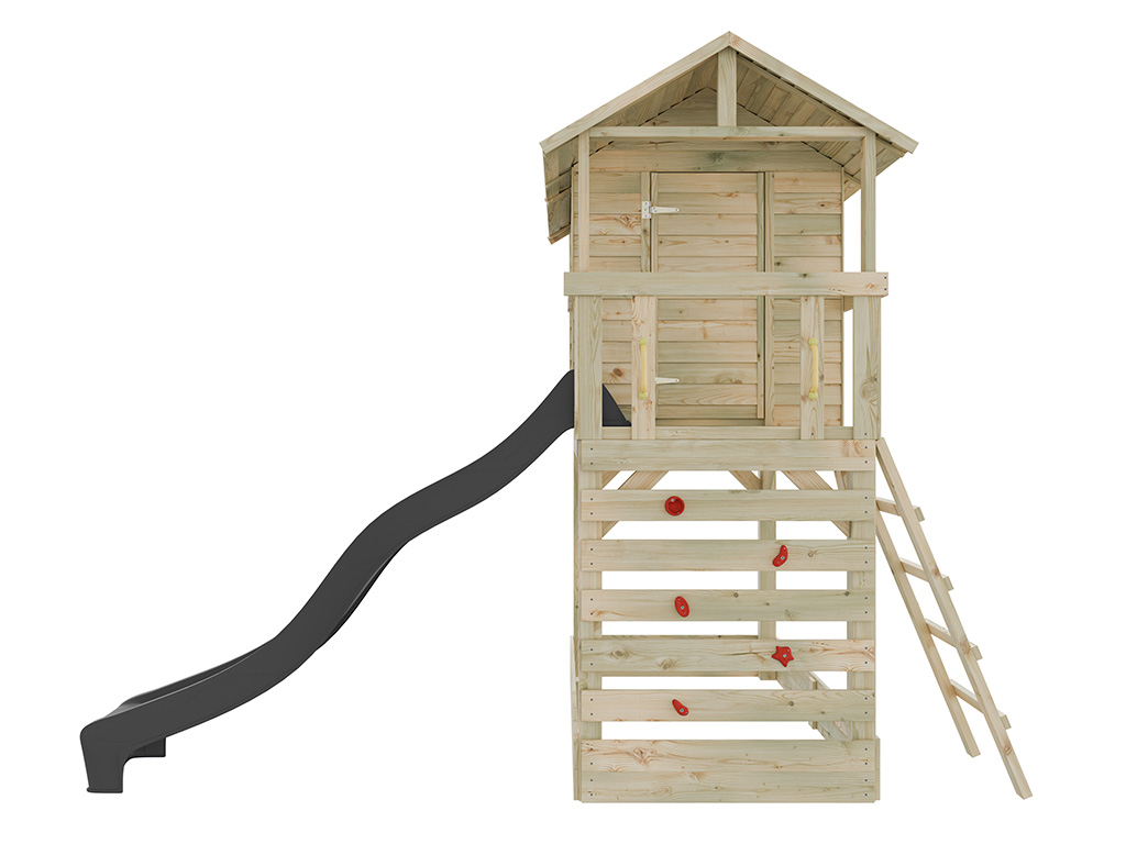 L’équipement inclut une échelle inclinée pour un accès sûr à la cabane. Pour encore plus de plaisir, la cabane est équipée d’un mur d’escalade avec 5 prises d’escalade rouges. - Avec toboggan