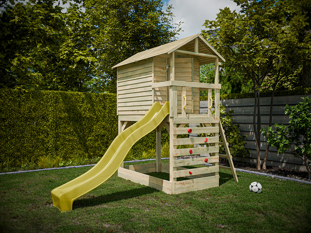 Commentaires client pour "Cabane sur pilotis en bois autoclave avec toboggan jaune Luis"
