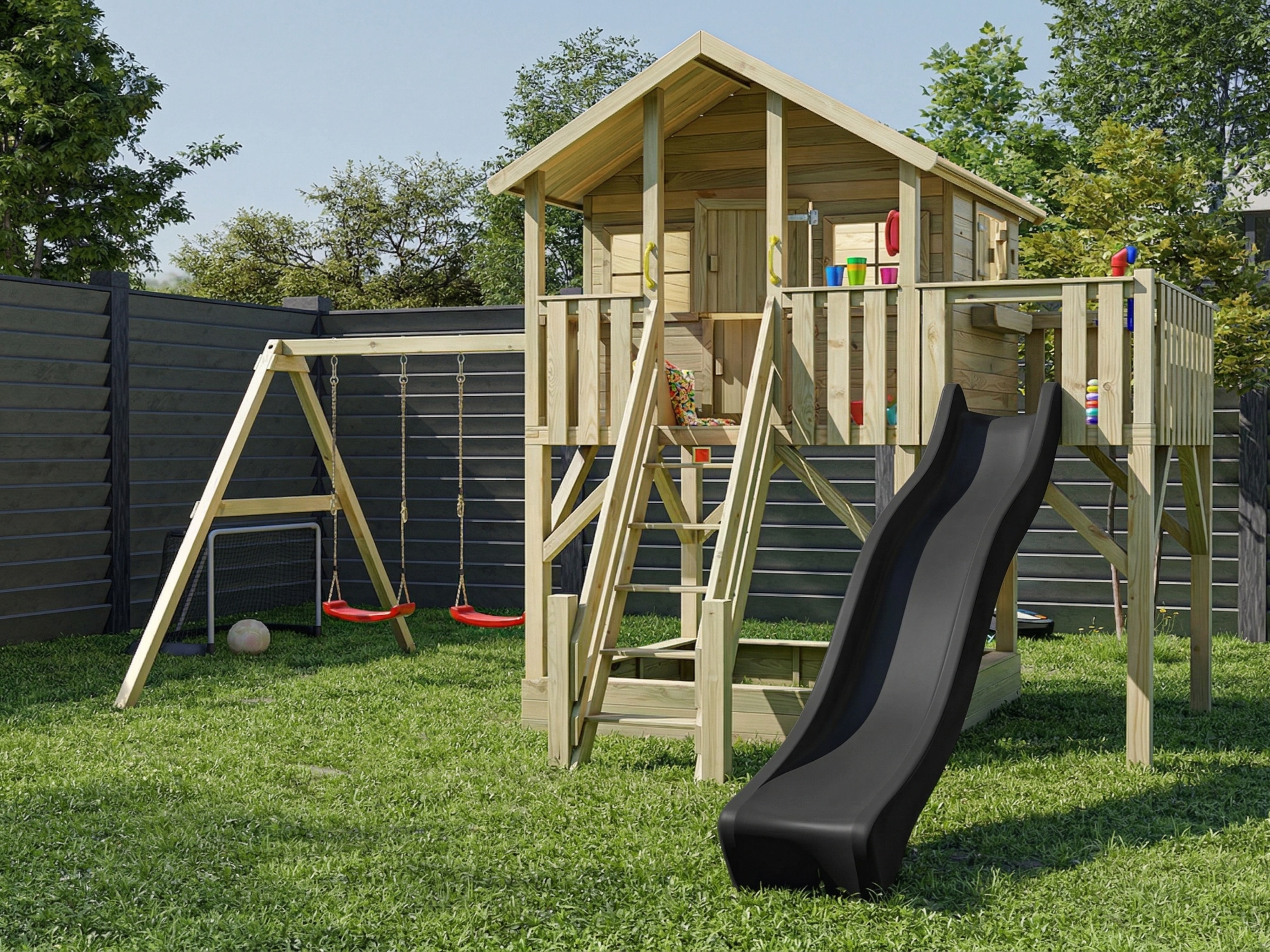 Cabane sur pilotis en bois autoclave "Big House XL" avec portique double et toboggan gris...plus