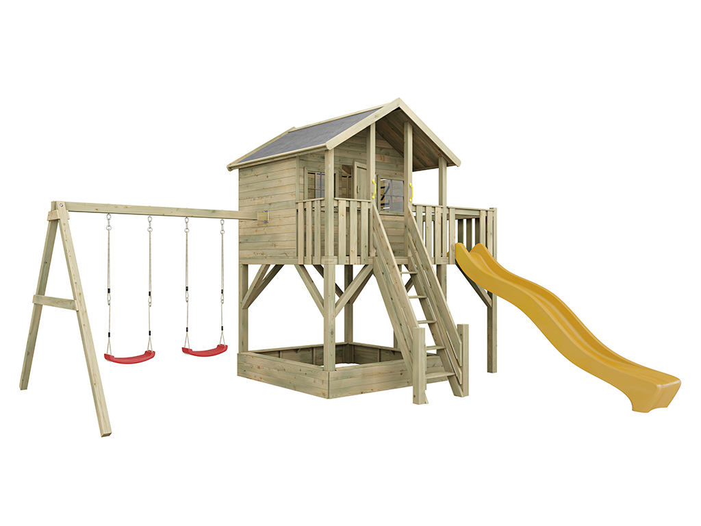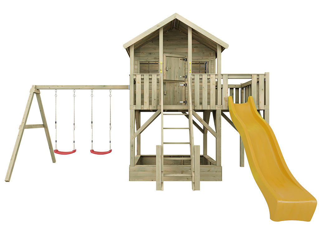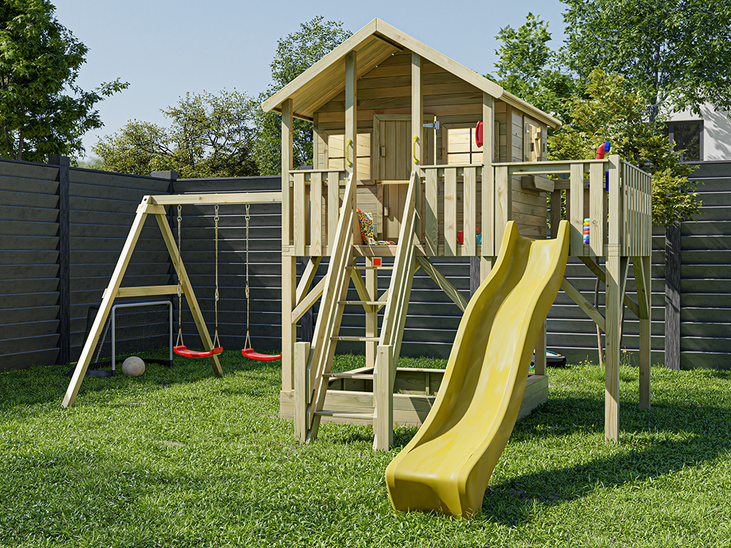 Cabane sur pilotis en bois autoclave “Big House XL” avec portique double et toboggan jaune...plus