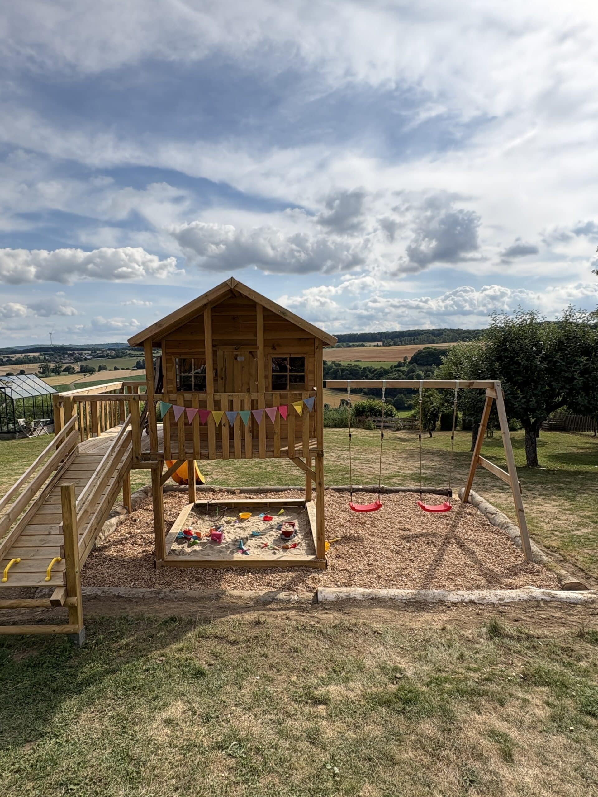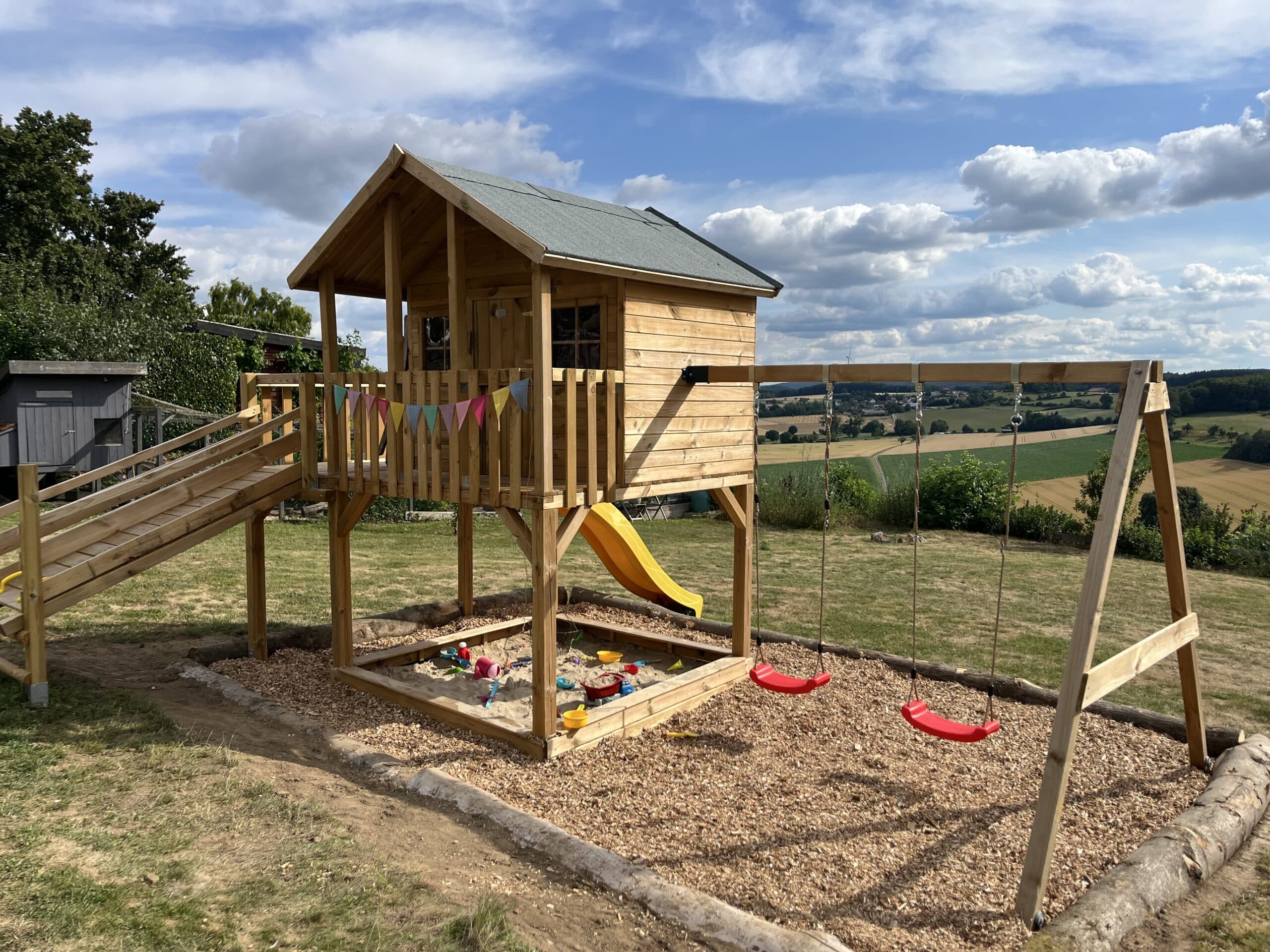 Commentaires client pour "Cabane sur pilotis en bois autoclave Big House XL avec portique double et toboggan jaune"