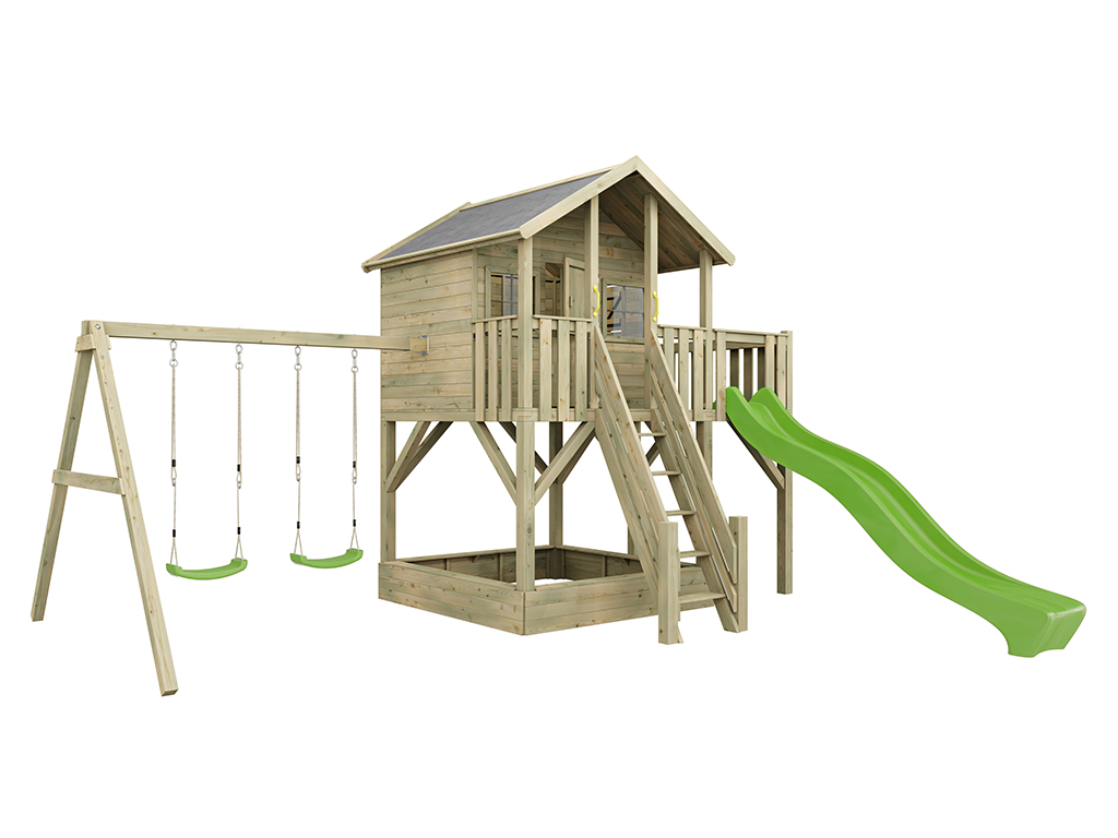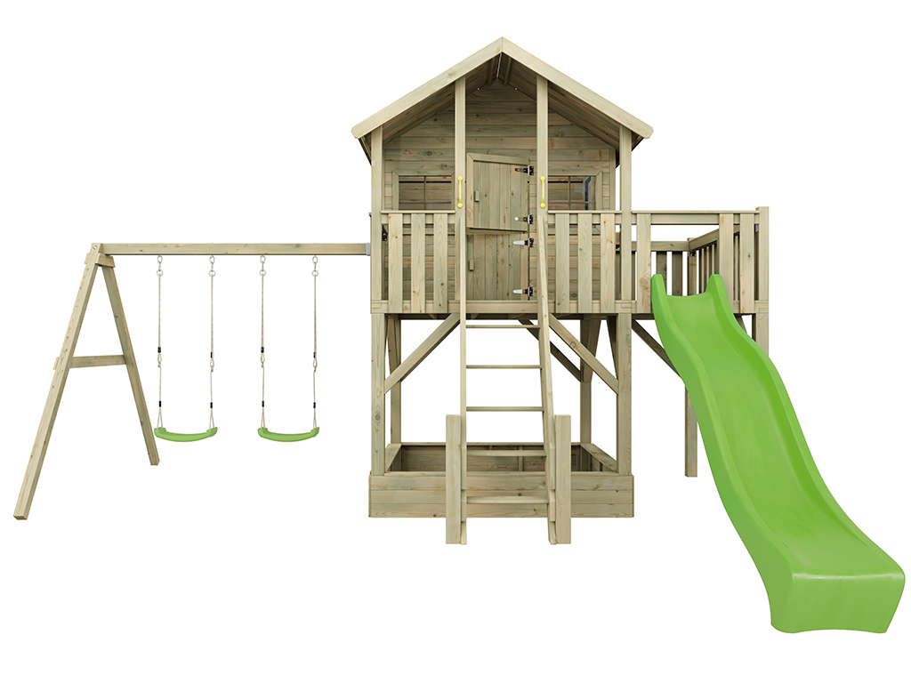 Cabane sur pilotis en bois autoclave Big House XL avec portique double et toboggan vert