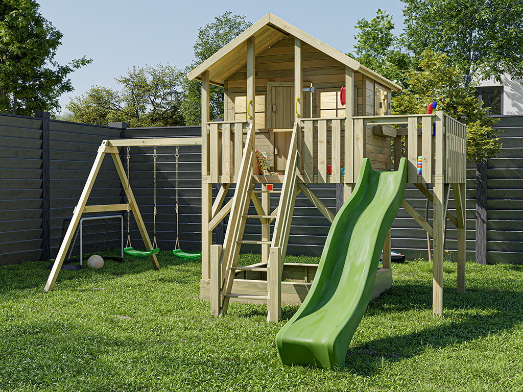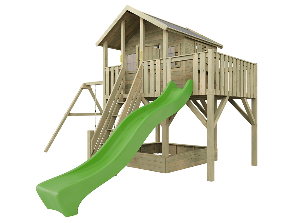 Cabane sur pilotis en bois autoclave “Big House XL” avec portique double et toboggan vert...plus