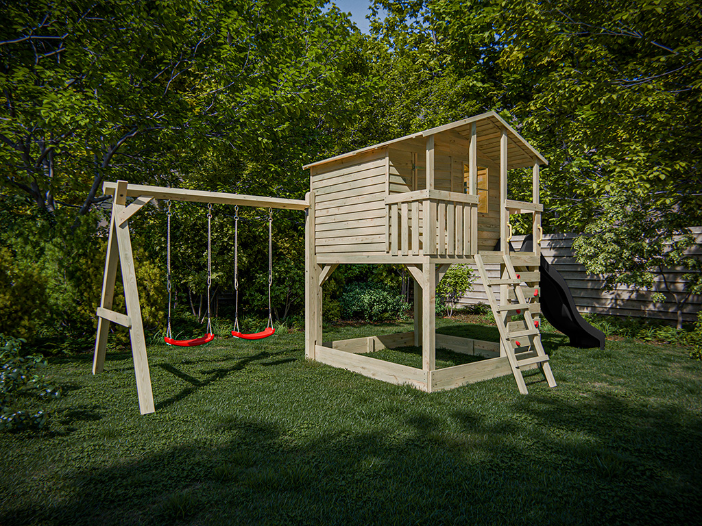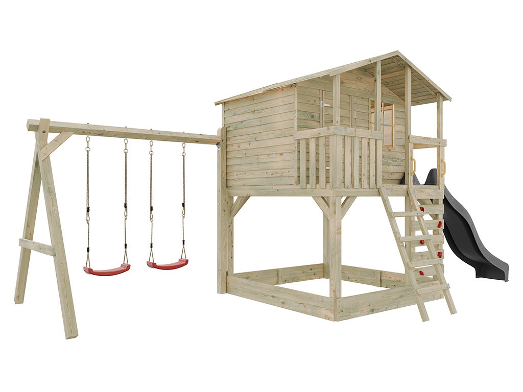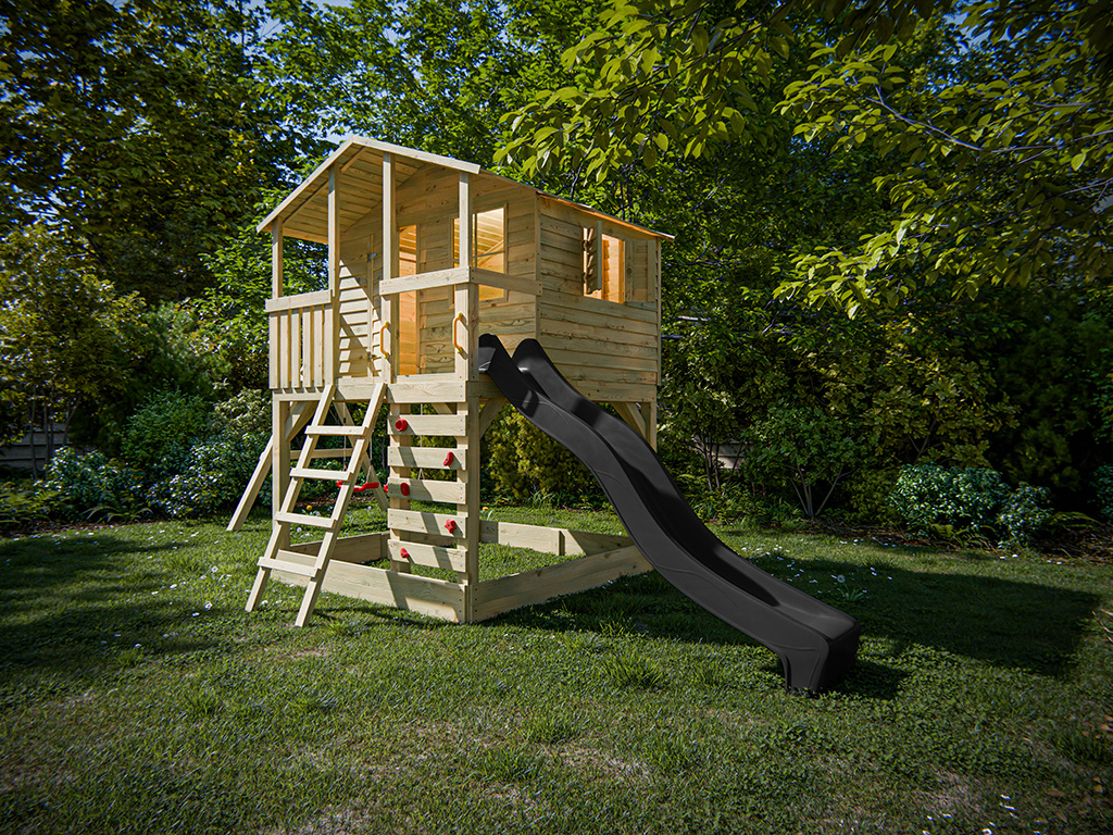 Commentaires client pour "Cabane sur pilotis en bois autoclave Henry avec portique double et toboggan gris"
