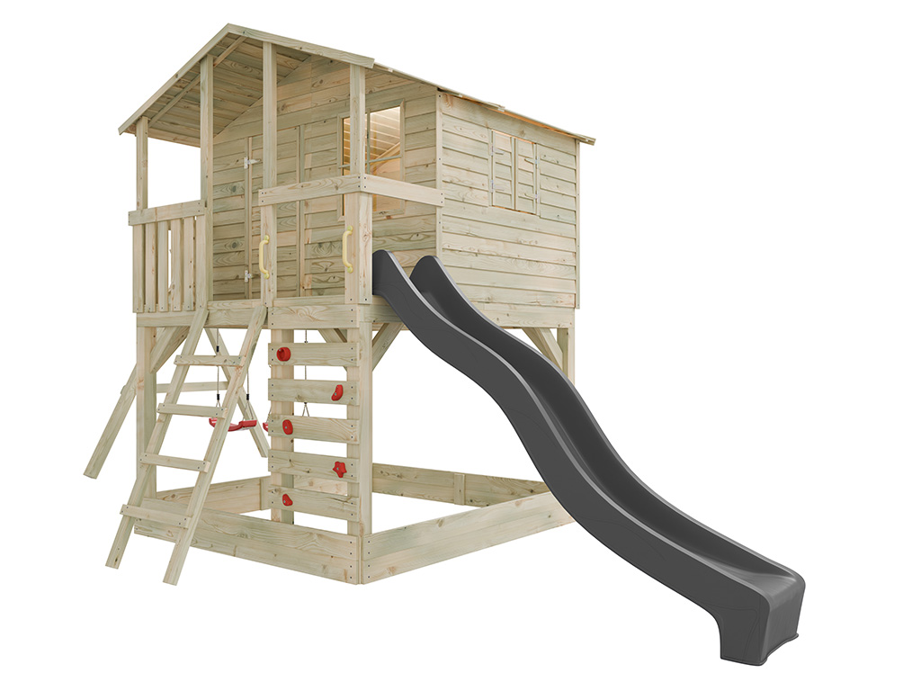 Cabane sur pilotis en bois autoclave Henry avec portique double et toboggan gris