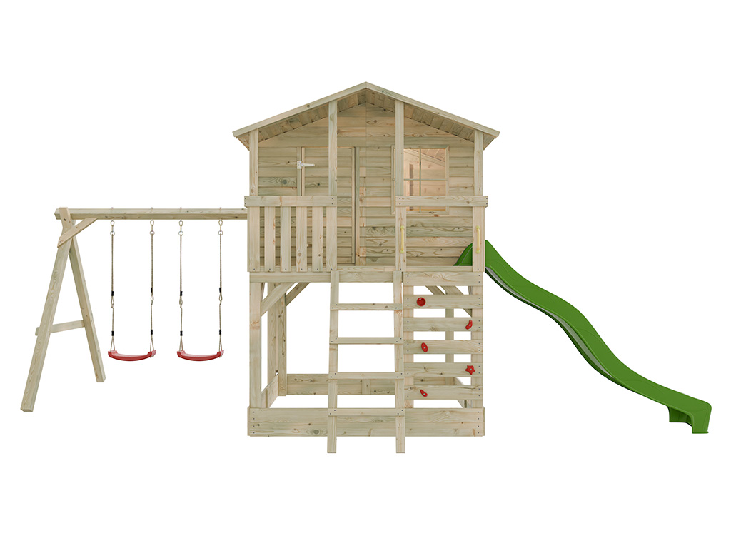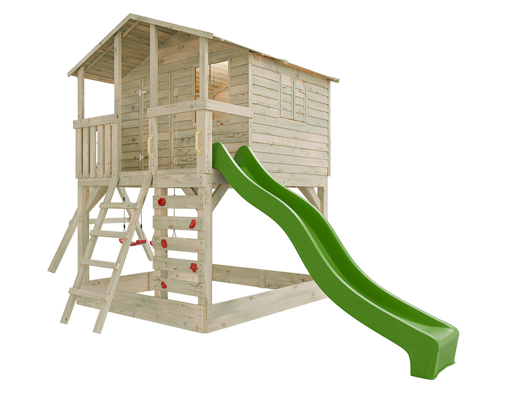 Cabane sur pilotis en bois autoclave Henry avec portique double et toboggan vert