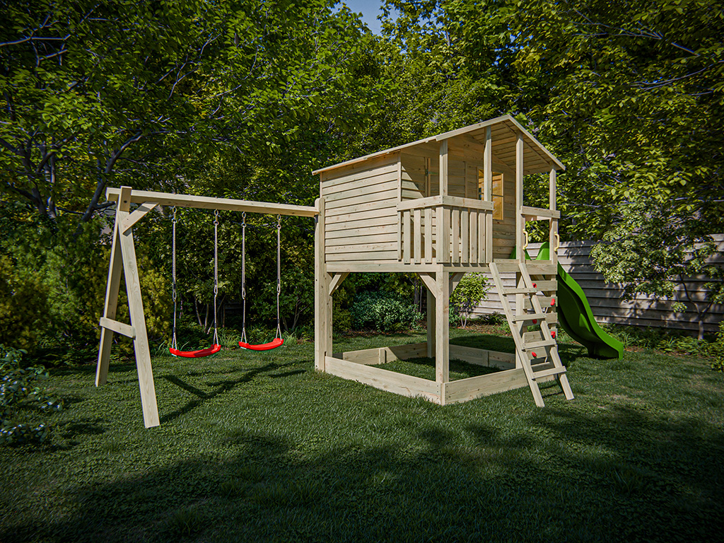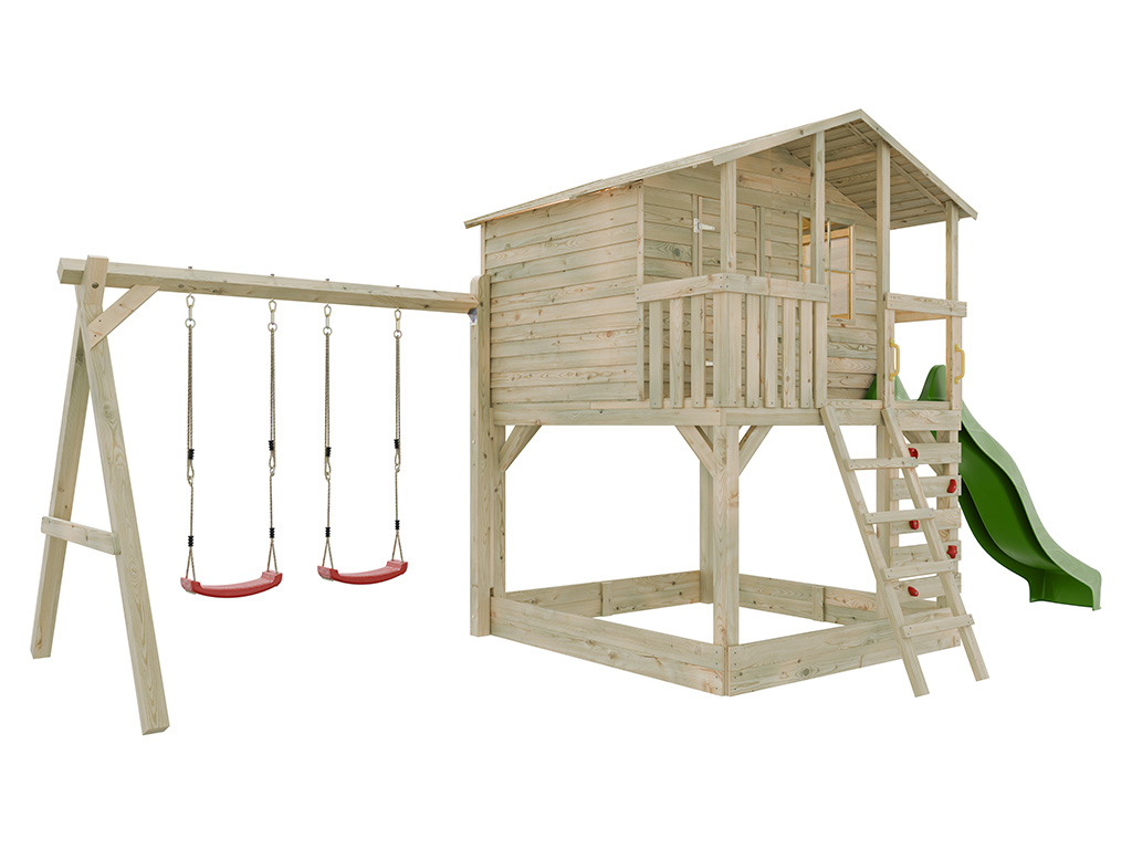 Commentaires client pour "Cabane sur pilotis en bois autoclave Henry avec portique double et toboggan vert"