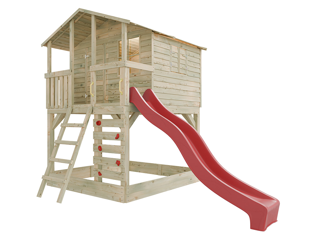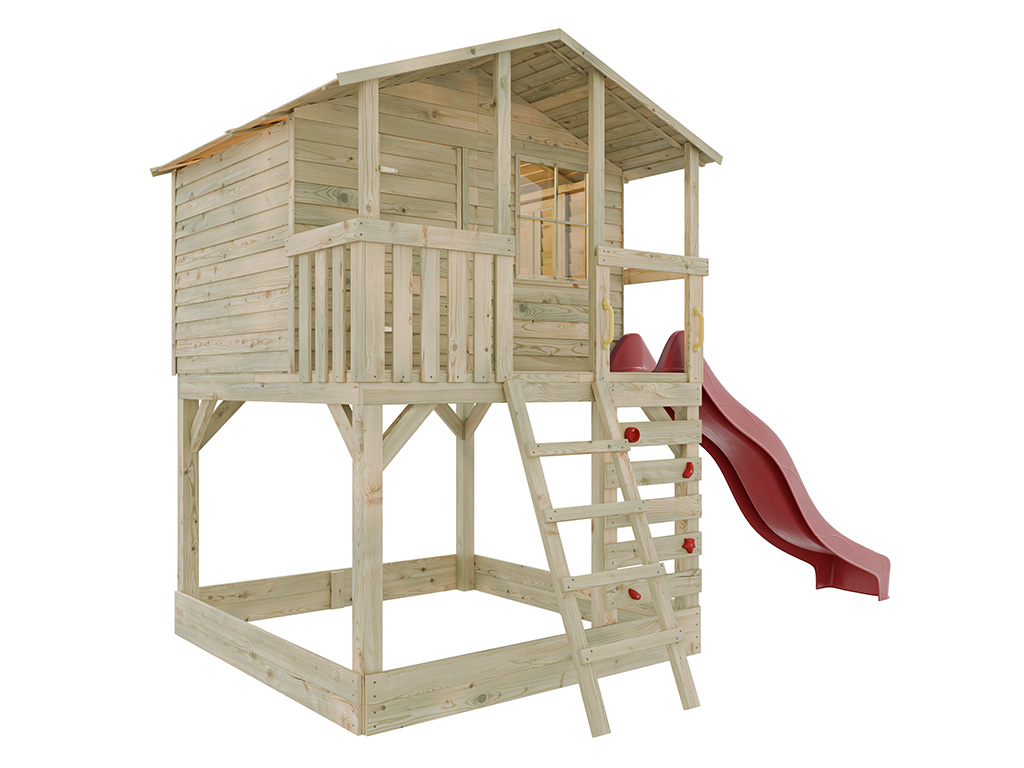 Cabane sur pilotis en bois autoclave Henry avec toboggan rouge