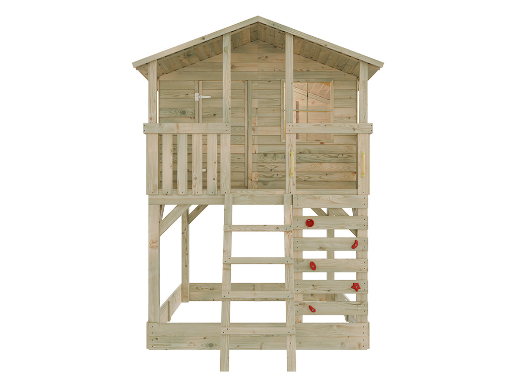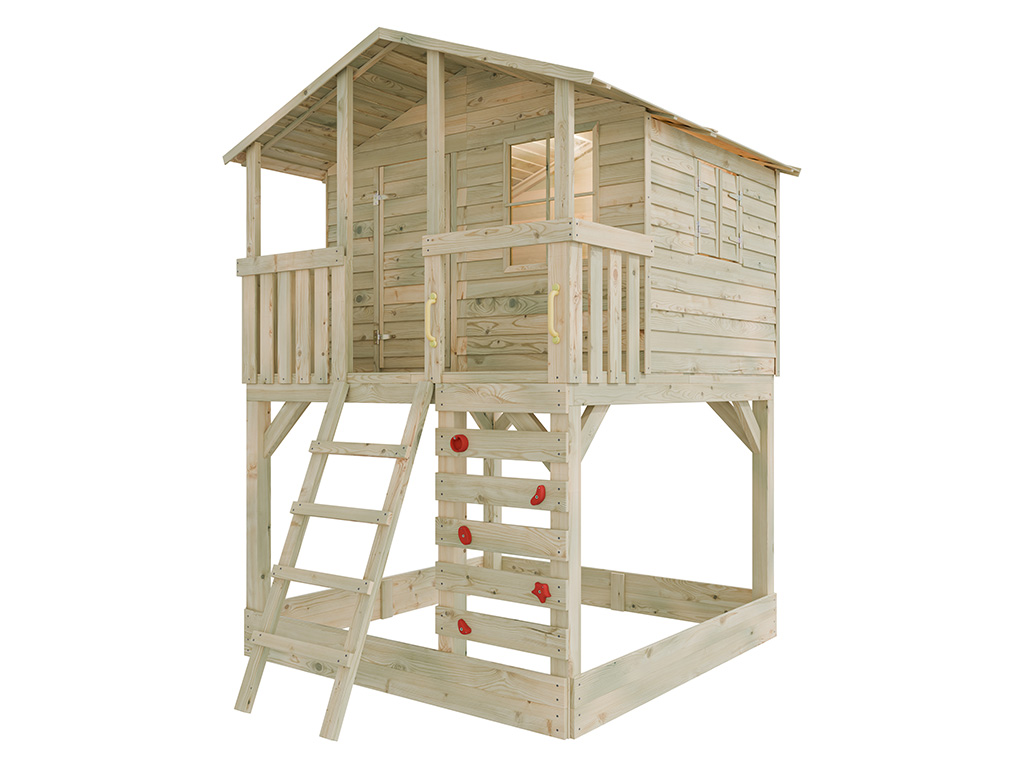 Le kit comprend une échelle inclinée pour un accès sécurisé. Pour encore plus de divertissement, la cabane est équipée d'un mur d'escalade avec 5 prises rouges. - Montage simple et rapide