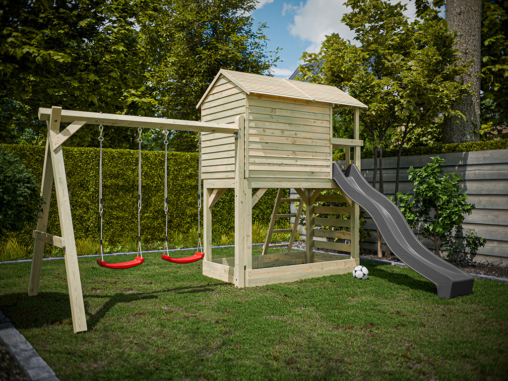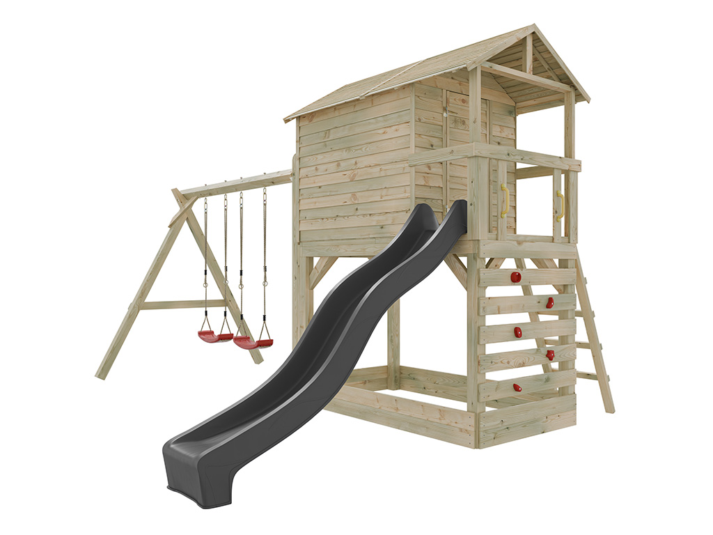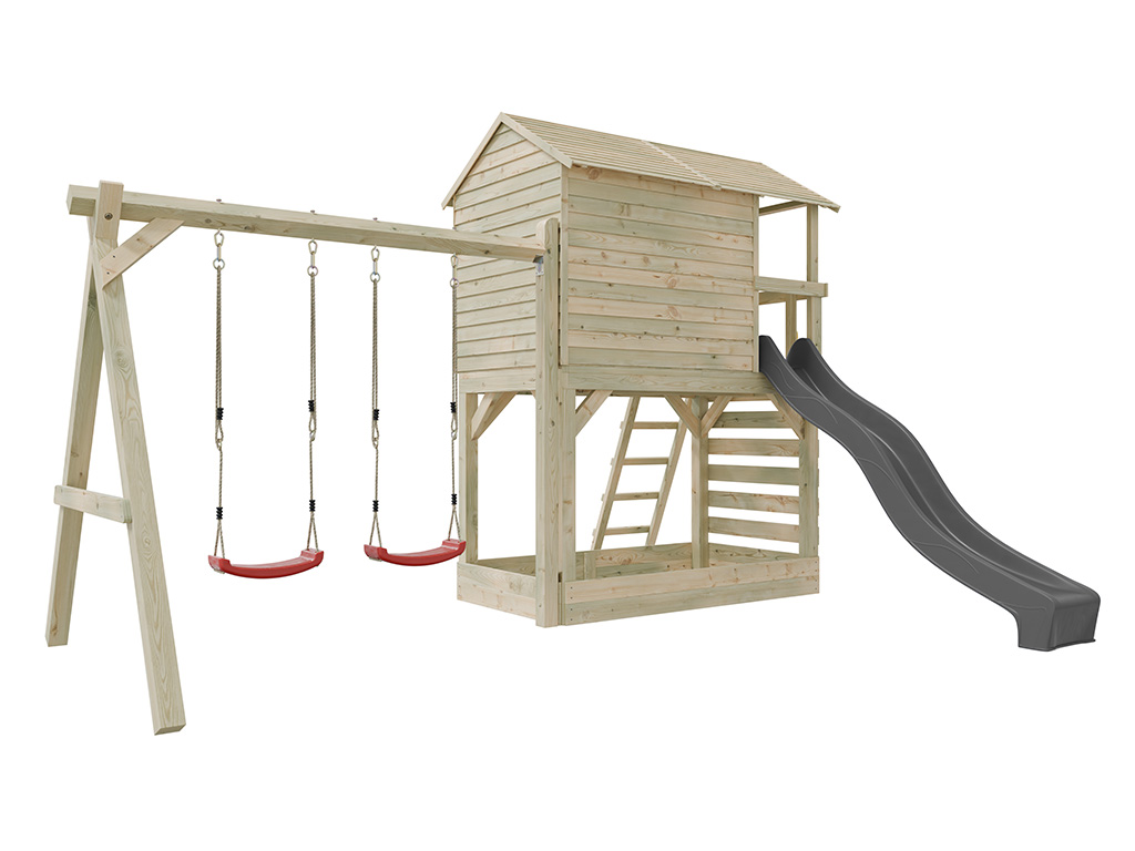 Ce pack inclut, en plus de la cabane sur pilotis, une extension avec un portique double équipé de deux sièges de balançoire rouges en plastique, ainsi qu’un toboggan à vague. À noter : l'extension balançoire ne peut être fixée qu'à l'un des poteaux arrière et uniquement sur le côté opposé à celui où le toboggan est installé. Le toboggan peut être transformé en glissière d'eau en quelques étapes simples. Pour cela, un raccord pour tuyau d'arrosage est prévu sous le toboggan, nécessitant la réalisation d'un trou unique.