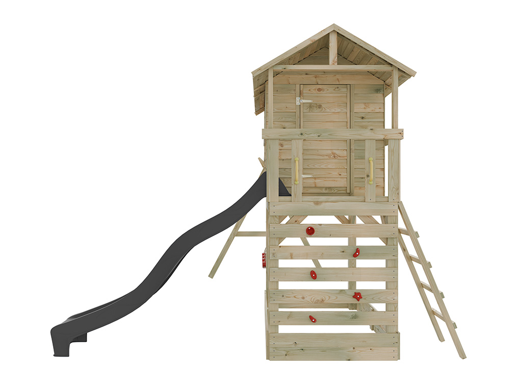 Le kit comprend une échelle inclinée pour un accès sûr. Pour encore plus de plaisir, la cabane est équipée d'un mur d'escalade avec 5 prises rouges.