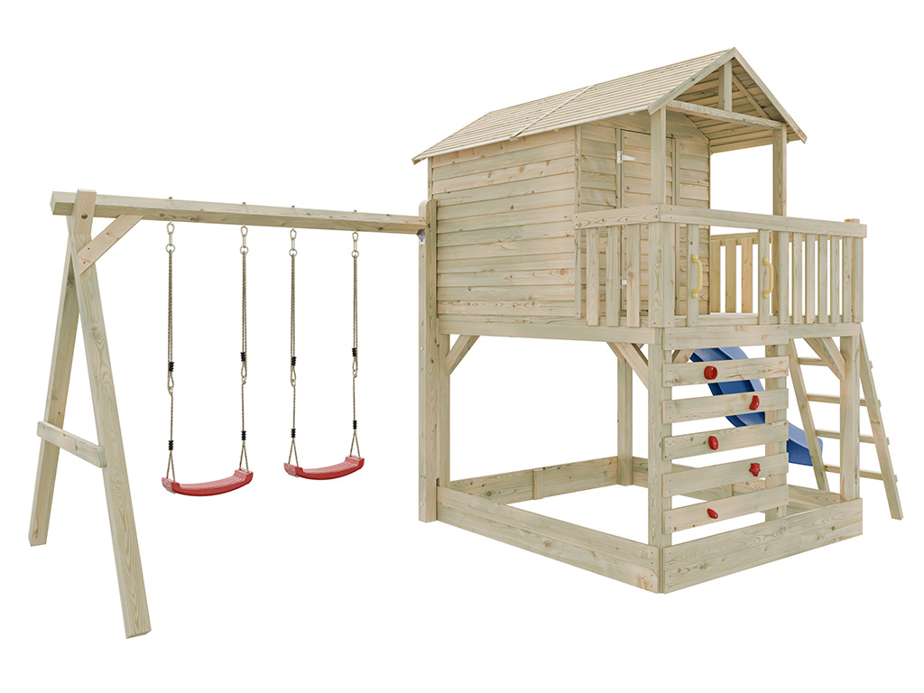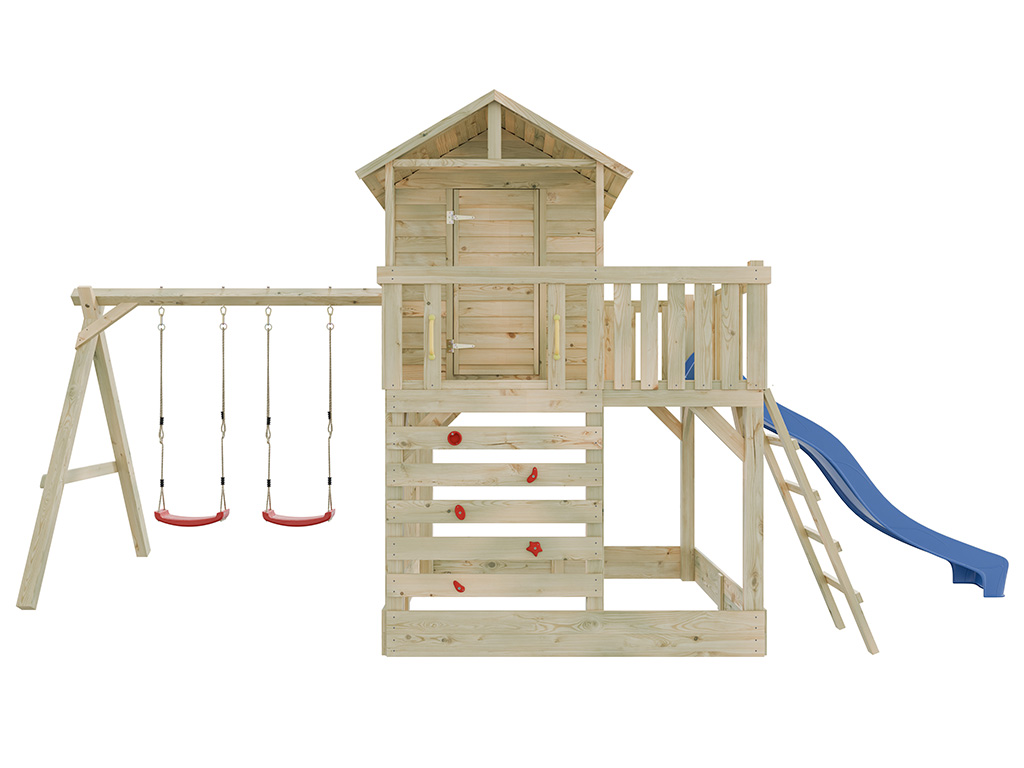 Commentaires client pour "Cabane sur pilotis en bois autoclave Noah avec portique double et toboggan bleu"
