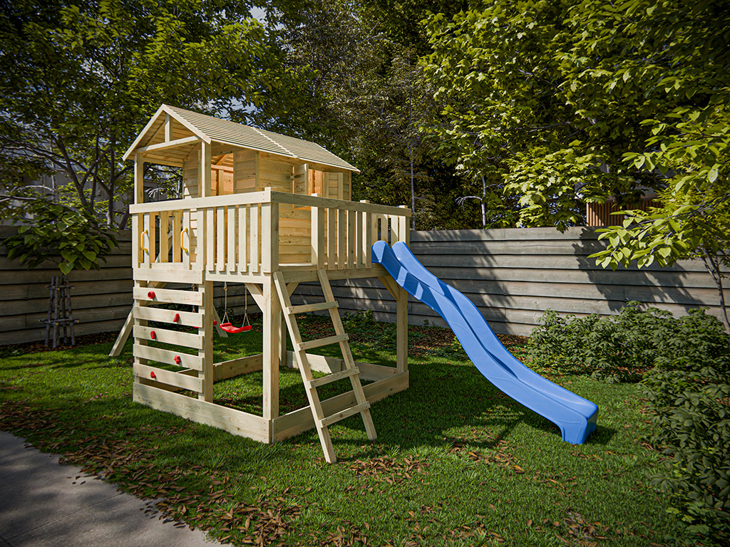 Cabane sur pilotis en bois autoclave Noah avec portique double et toboggan bleu