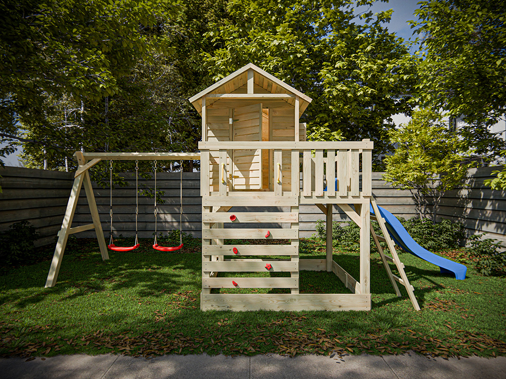 Ce pack comprend, en plus de la cabane, une extension avec une portique double équipée de deux sièges rouges en plastique, ainsi qu’un toboggan à vague. Veuillez noter que l’extension de la balançoire ne peut être fixée qu’à l’un des poteaux arrière et que le toboggan ne peut être monté que sur le côté opposé. Le toboggan peut être transformé en glissière d’eau en quelques gestes simples grâce à une connexion pour tuyau d’arrosage située en dessous, qu’il est possible d’installer avec un simple trou de perçage. - Montage simple et rapide