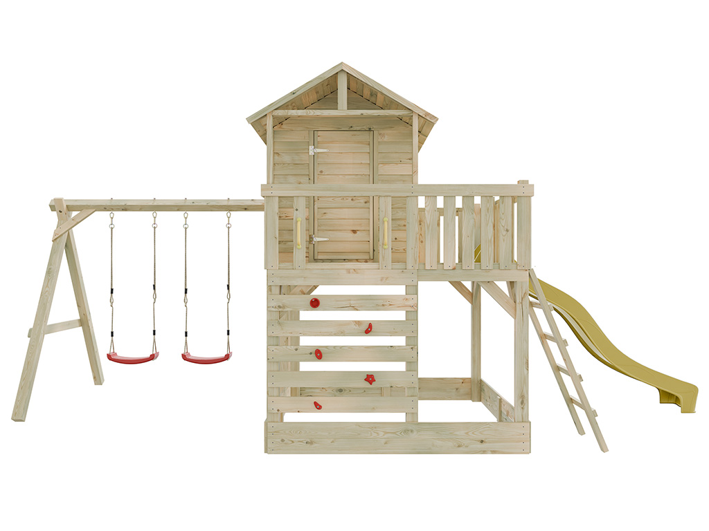 Commentaires client pour "Cabane sur pilotis en bois autoclave Noah avec portique double et toboggan jaune"