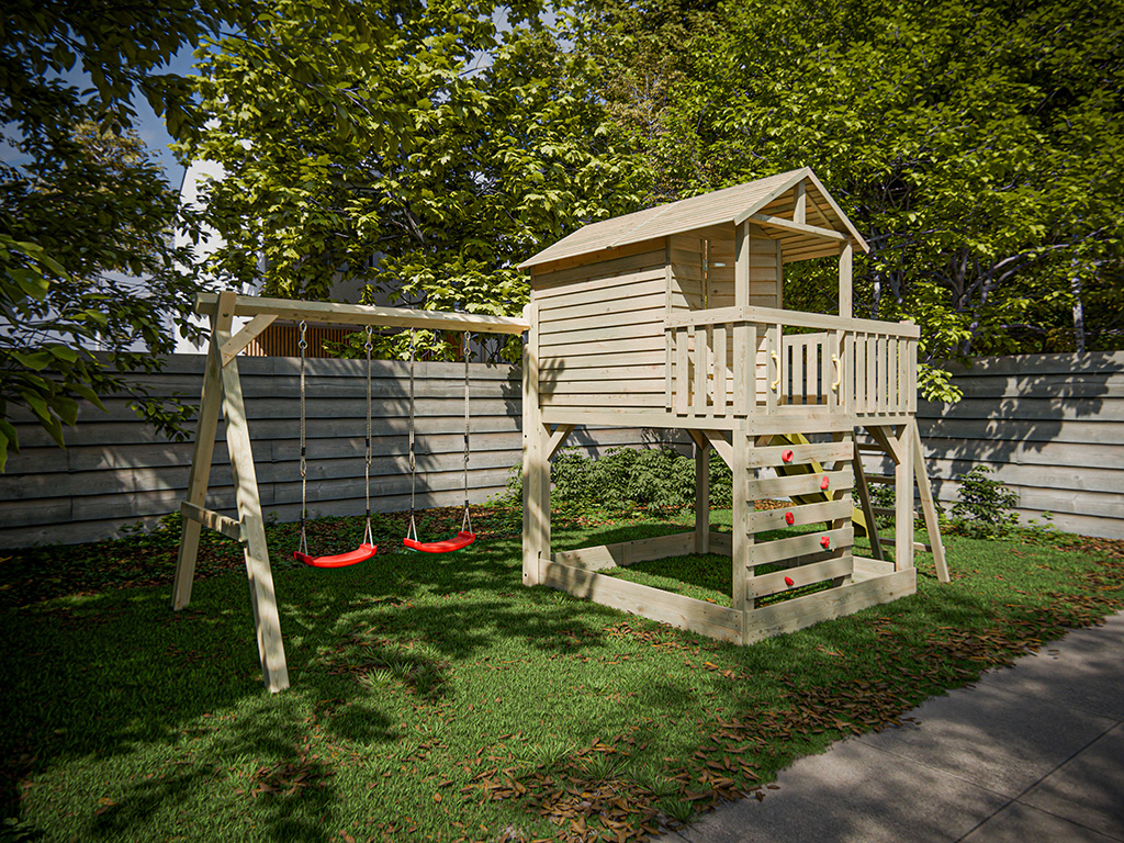 Le kit comprend une échelle inclinée pour un accès sécurisé. Pour encore plus de plaisir, la cabane est équipée d’un mur d’escalade avec 5 prises rouges. - Inclut un portique double et un toboggan