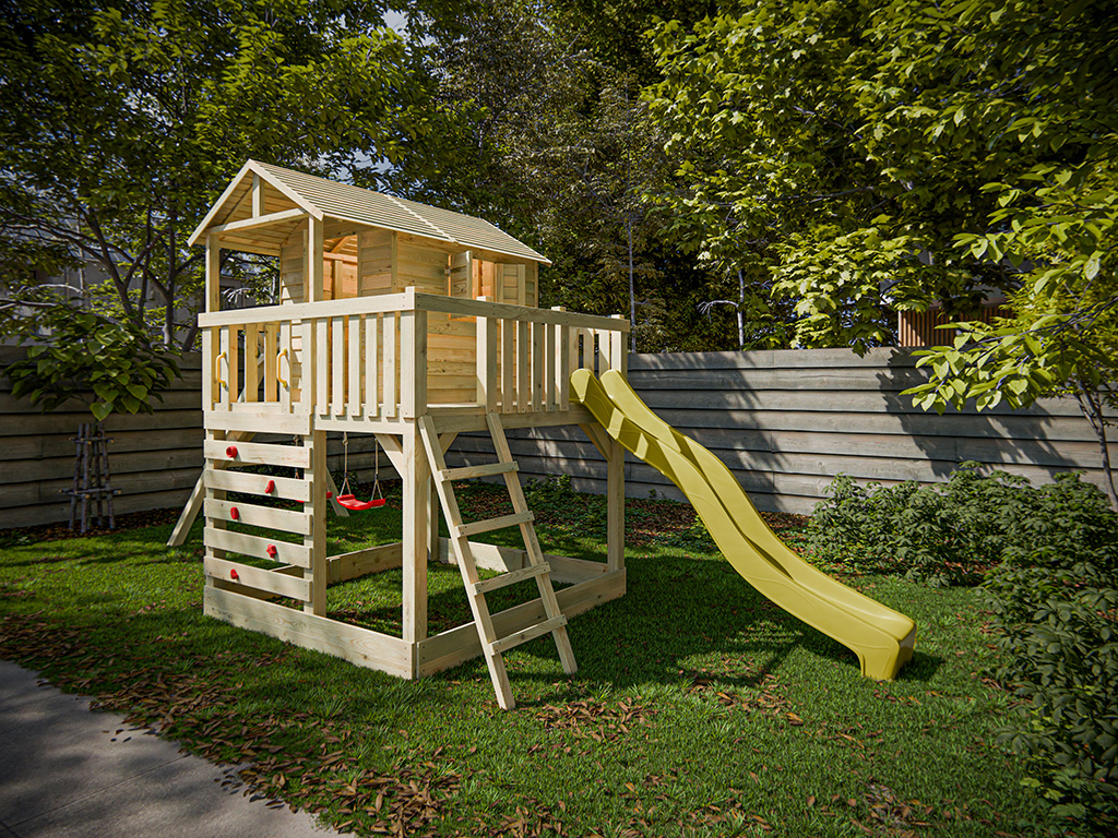 Cabane sur pilotis en bois autoclave Noah avec portique double et toboggan jaune