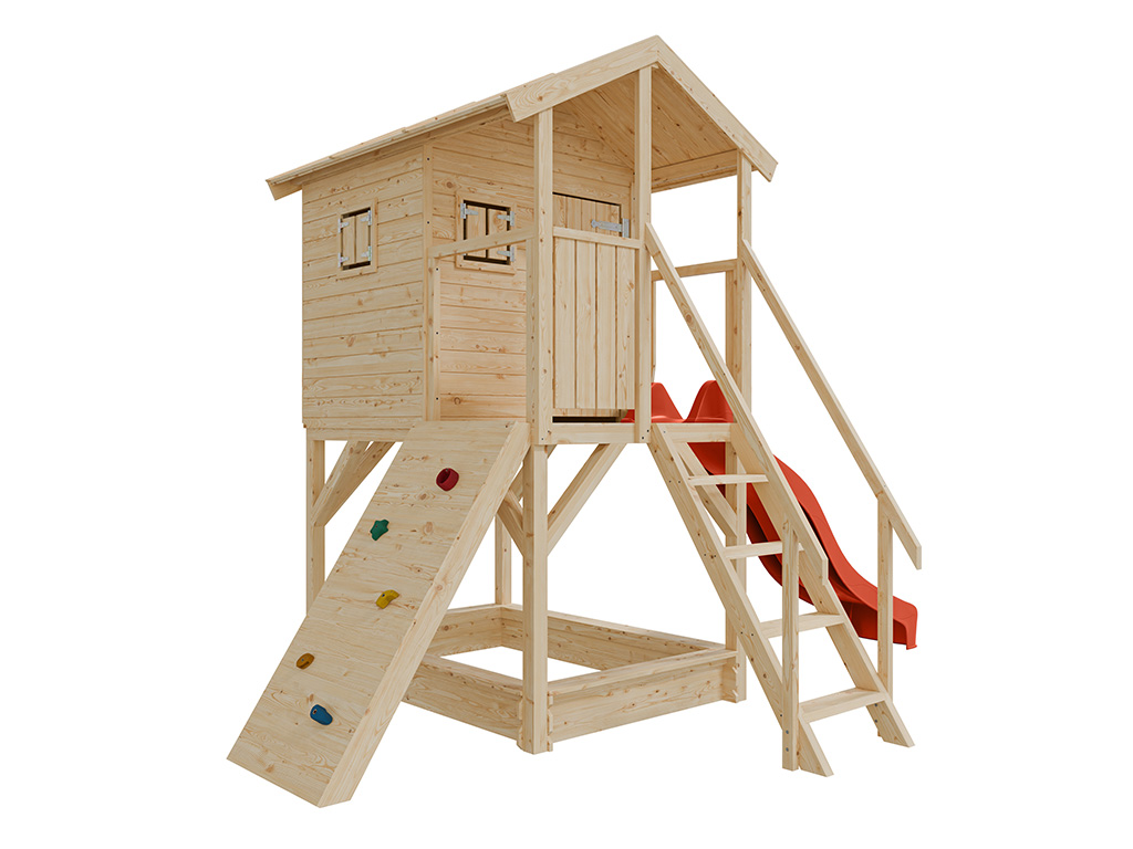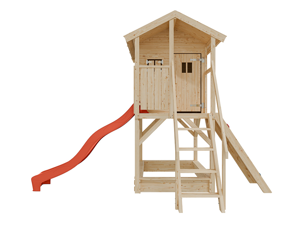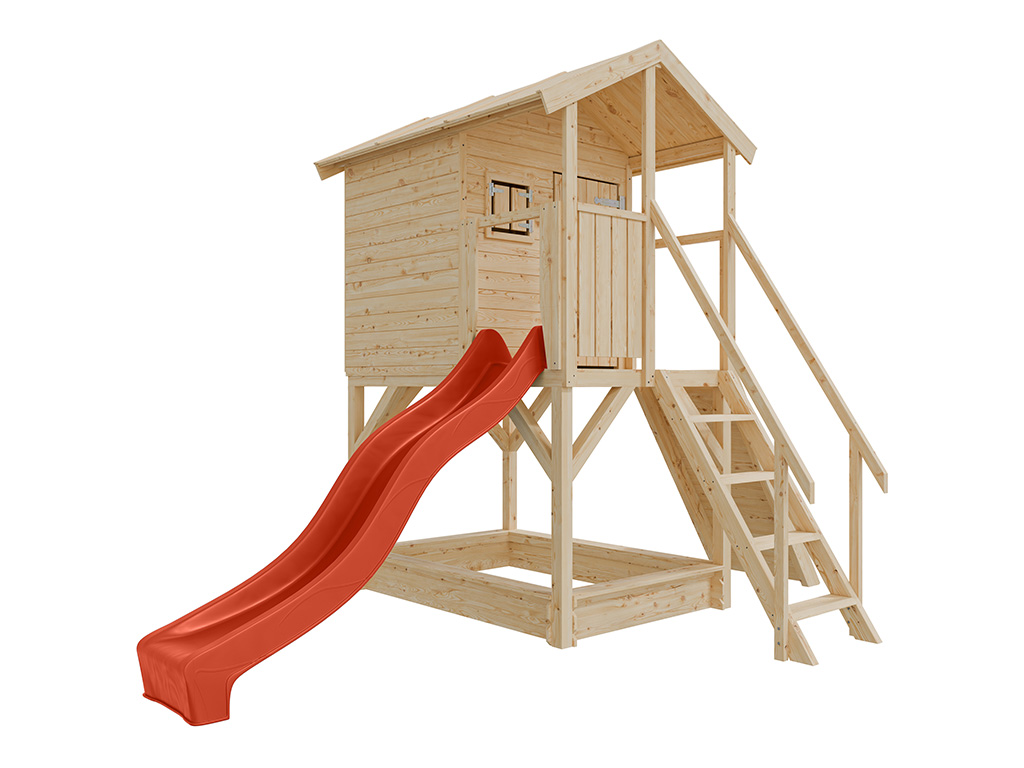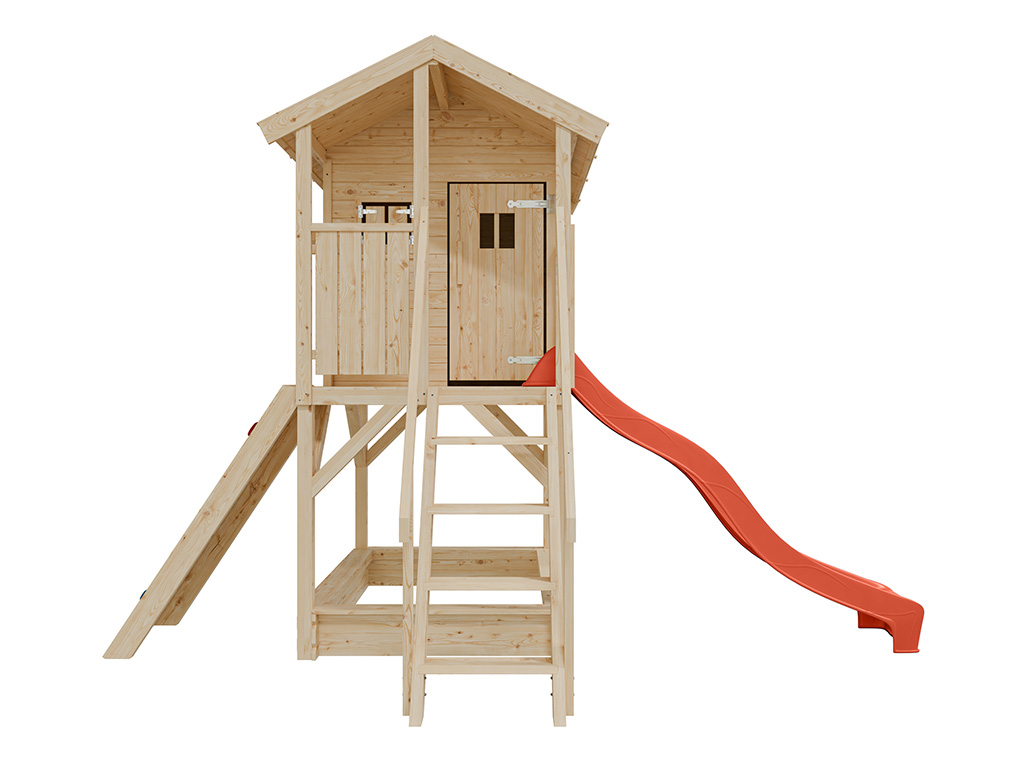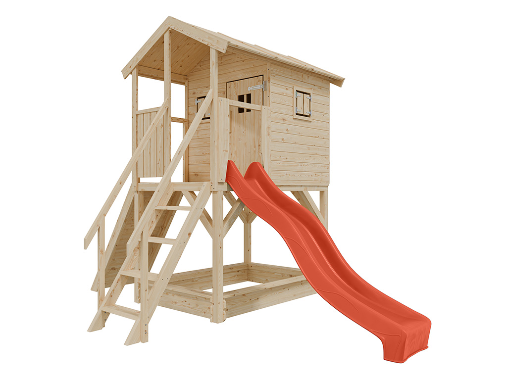 Cabane sur pilotis en bois brut avec toboggan rouge “Nele”