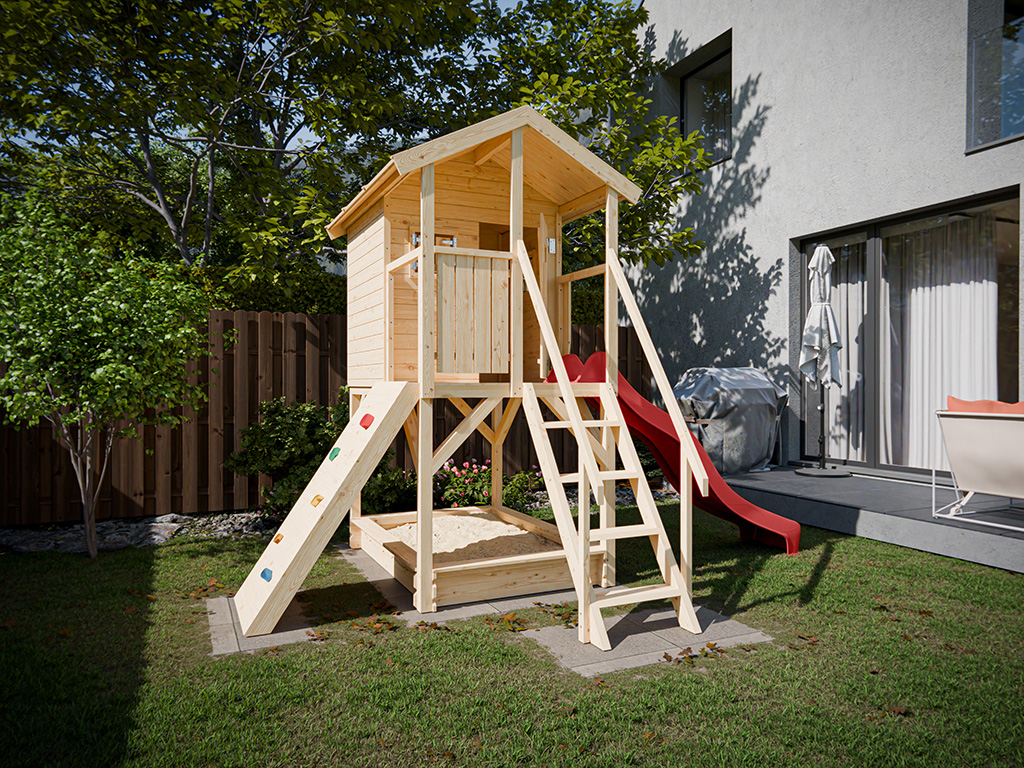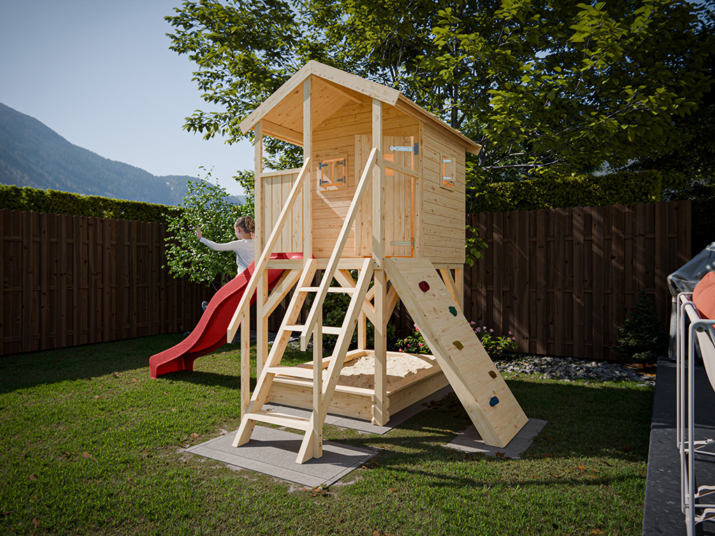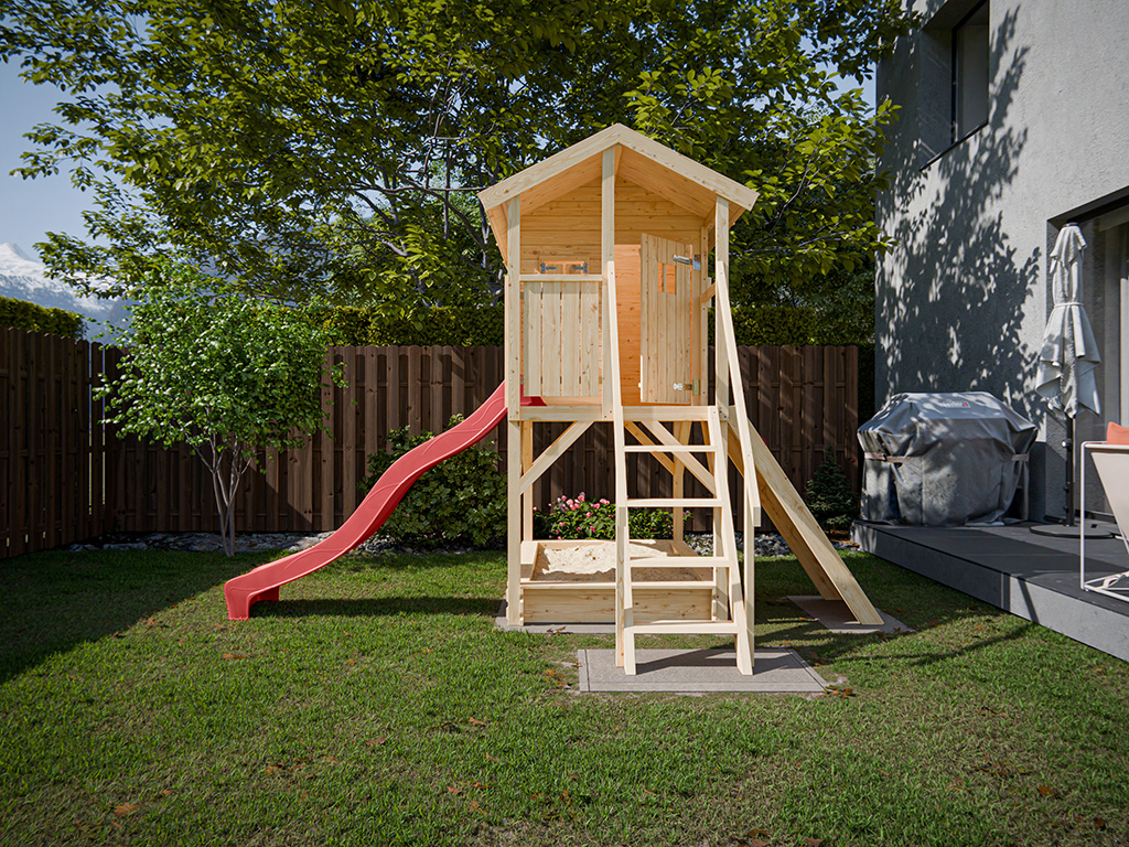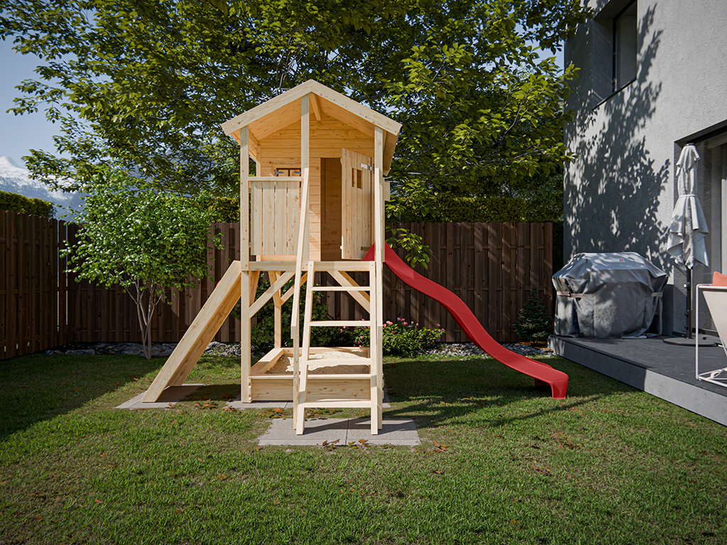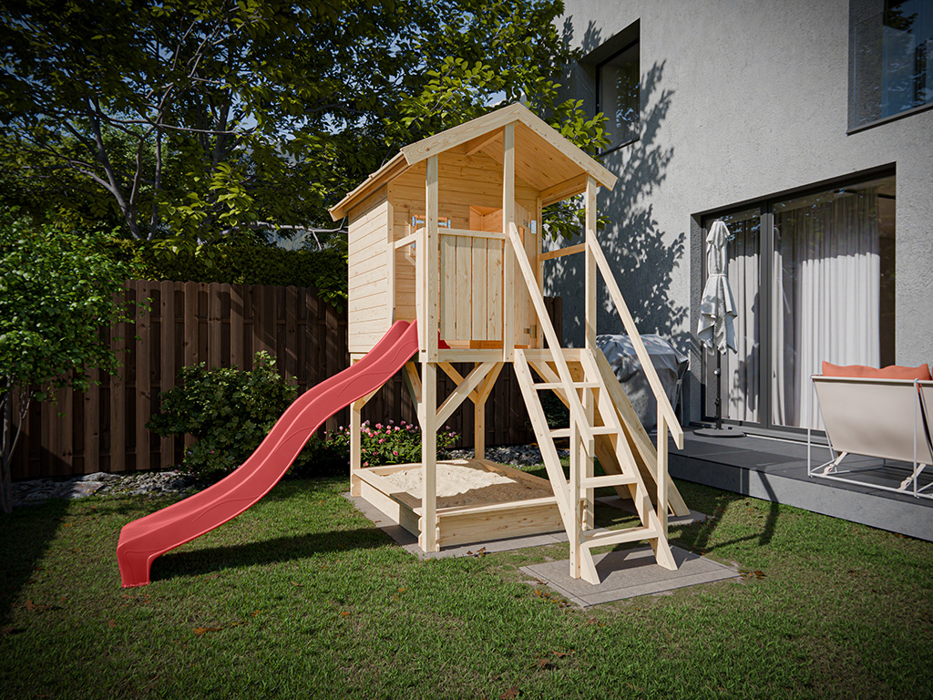 Cabane sur pilotis en bois brut avec toboggan rouge “Nele”