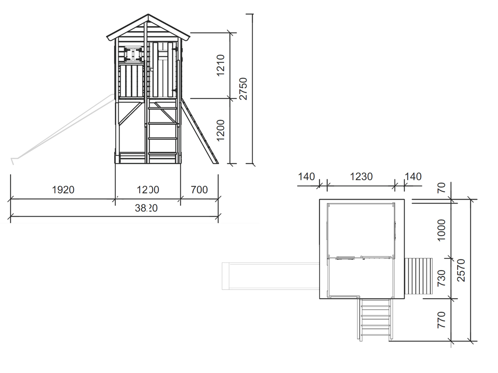 Cette cabane sur pilotis est équipée d’un escalier avec marches encastrées et rampe de chaque côté, permettant une montée en toute sécurité, même pour les plus petits. De l'autre côté de la véranda de 73 cm de large, un mur d’escalade avec 5 prises offre des heures de plaisir à grimper. Nous recommandons d’ajouter des poignées pour encore plus de sécurité à cet endroit. Consultez notre gamme d’accessoires à ce sujet. - Avec fenêtres