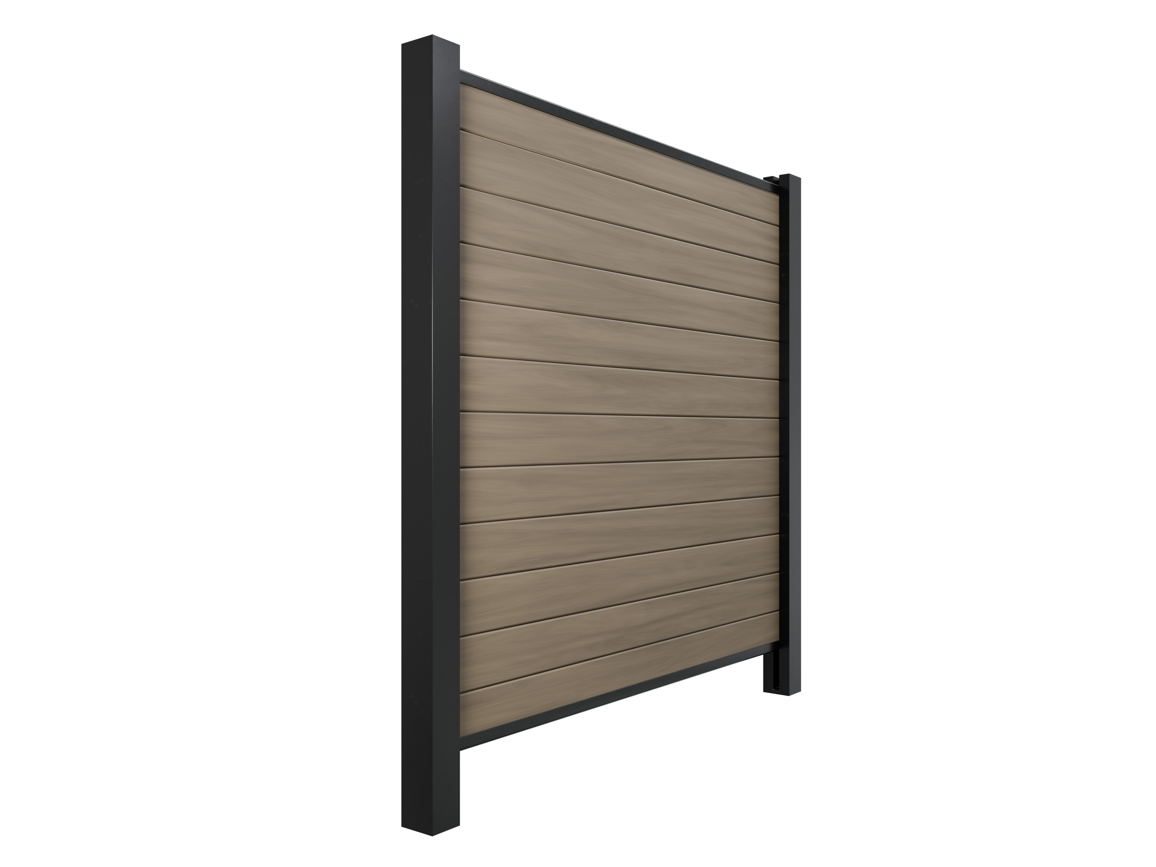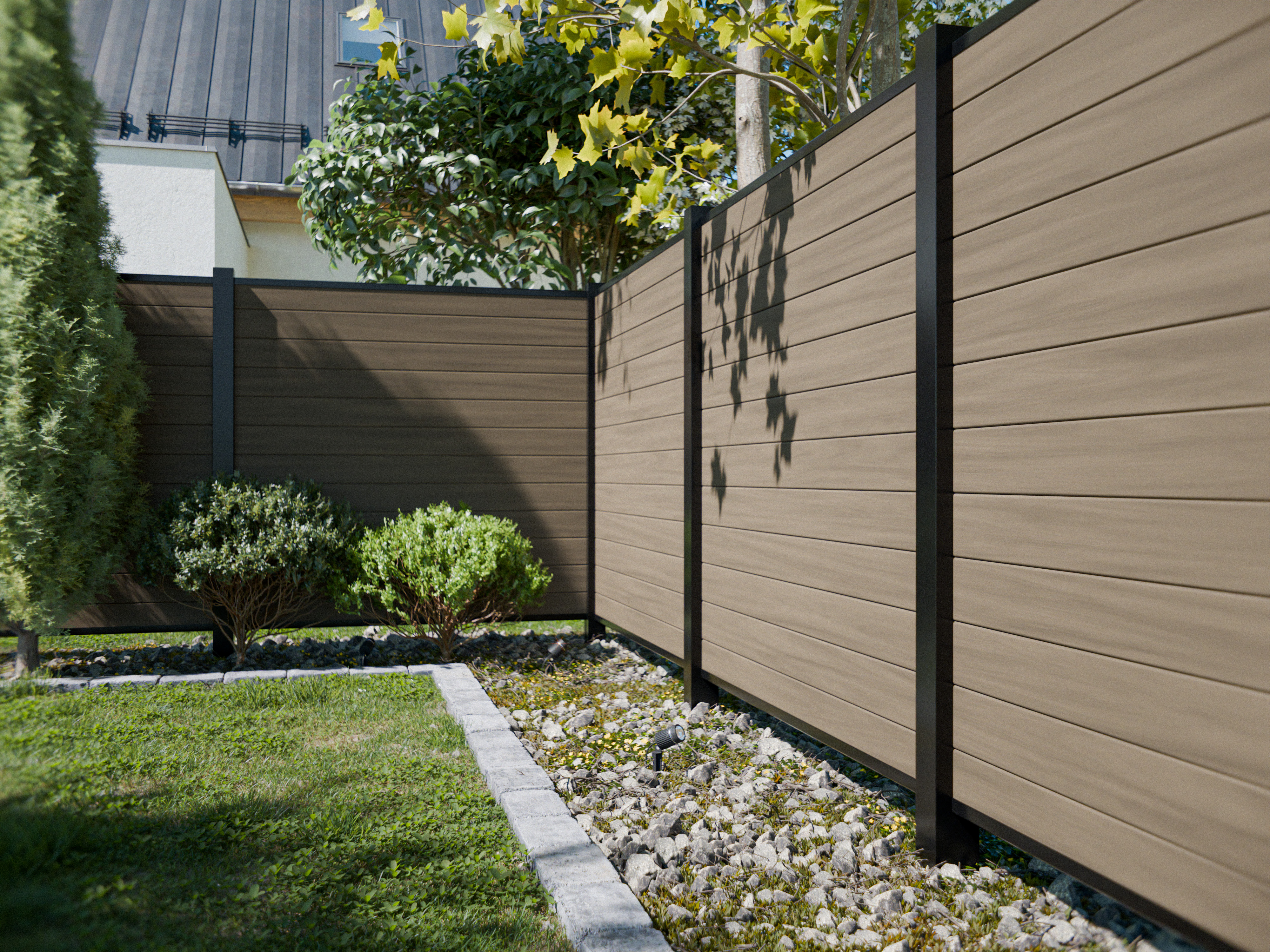 Clôture de jardin, clôture pare-vue, système d'emboîtage en PVC, surface structure bois noyer