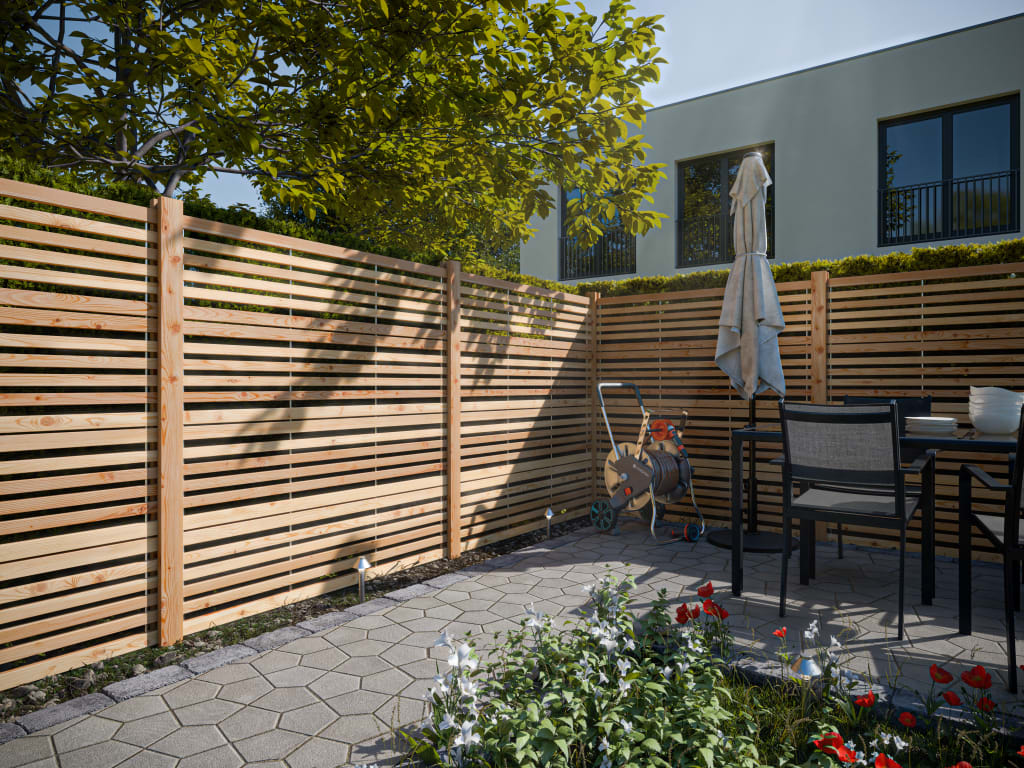Les clôtures à emboîter se montent rapidement et facilement en quelques gestes. Il suffit d'insérer les planches dans les rainures longitudinales des poutres, en veillant à ce que le système à rainure et languette soit bien ajusté pour chaque planche.