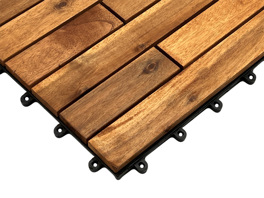 Ces caillebotis de terrasse de 24 mm d'épaisseur sont fabriqués en bois d'acacia. Polyvalents, ils s'utilisent aisément en intérieur comme en extérieur. Les dalles sont équipées d'un système de clipsage pratique, qui permet un montage et un démontage rapides et sans complication.