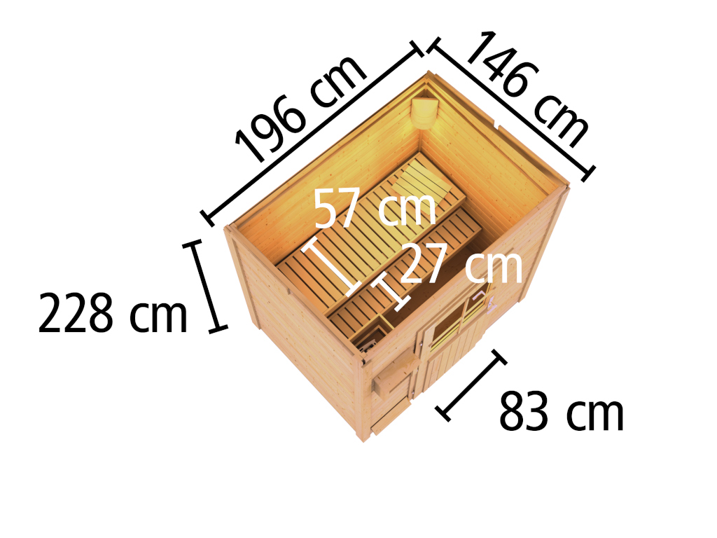 - Veuillez noter : ce sauna est livré SANS poêle de sauna. Cependant, des variantes avec poêle de sauna sont disponibles (voir au-dessus du bouton d’ajout au panier). Vous trouverez en outre dans la boutique en ligne un large choix de poêles différents.