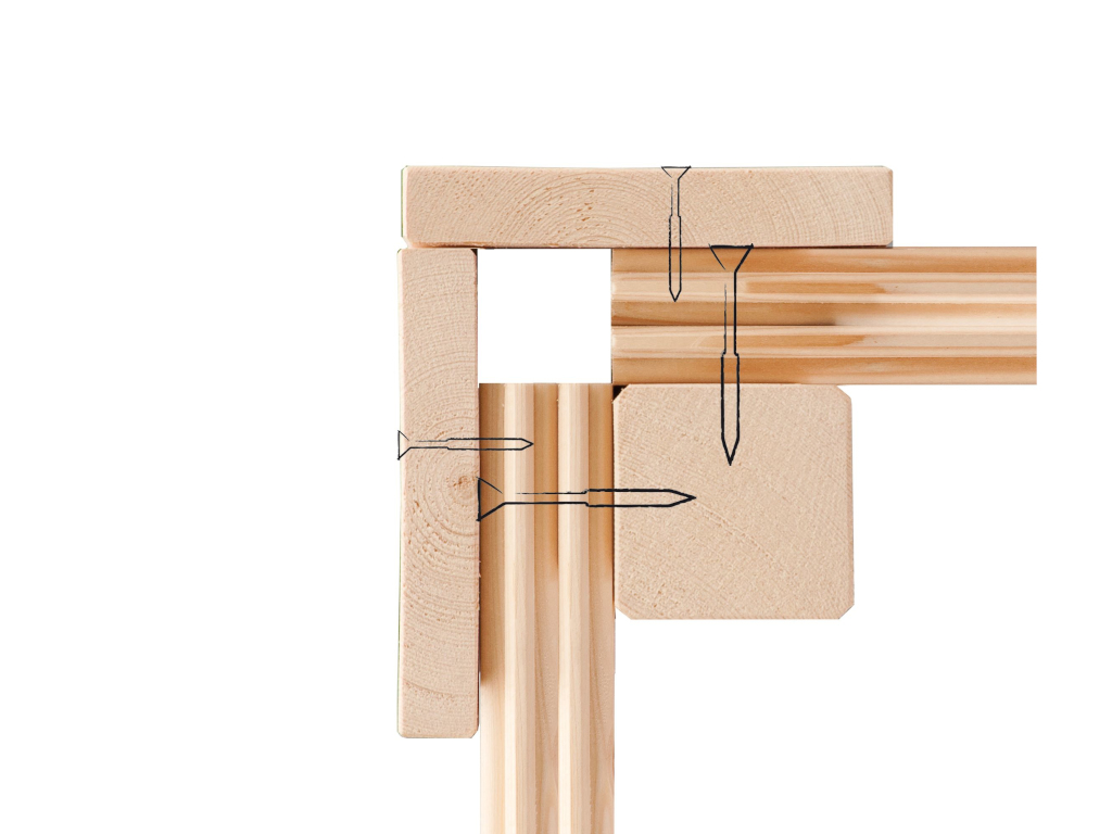 Le sauna extérieur en madriers de 38 mm d’épaisseur en épicéa se monte avec un système d’emboîtement / vissage. Avec des dimensions totales de 196 x 146 cm, il offre suffisamment de place pour des moments de bien-être au calme dans votre propre jardin. Le volume intérieur du sauna, avec une surface de 184 x 134 cm, est lui aussi généreusement dimensionné.