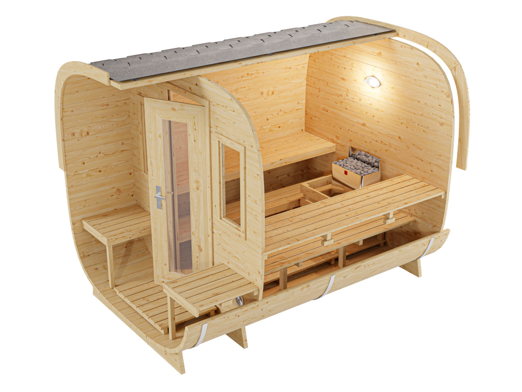 Ce modèle de sauna – un Sauna modulaire, c’est-à-dire un Sauna avec éléments préfabriqués – se distingue par sa construction sandwich spécifique : les éléments de paroi sont constitués de différentes couches. Les éléments de paroi préfabriqués en épicéa permettent un montage rapide en quelques heures seulement. Avec une épaisseur de paroi de 42 mm, les saunas modulaires sont parfaitement isolés et donc particulièrement économes en énergie. Grâce aux éléments très bien isolés, ce type de Sauna modulaire chauffe en plus un temps record.