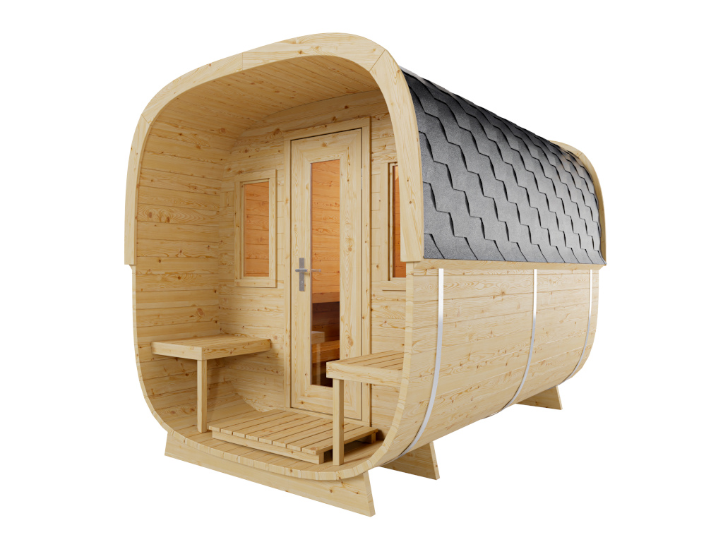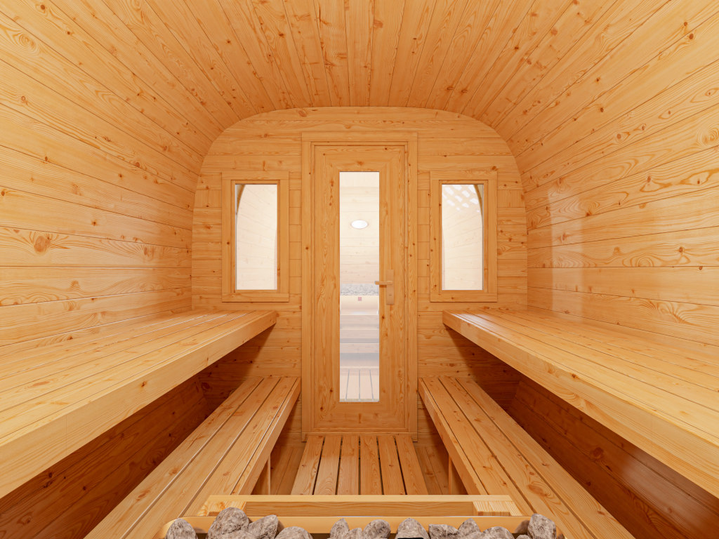 Les saunas tonneau séduisent par leur esthétique exceptionnelle qui attire tous les regards, tout en offrant d’excellentes performances techniques. Leur forme arrondie permet une circulation optimale de l’air et de la chaleur, ainsi qu’une montée en température particulièrement rapide et économique, sans accumulation de chaleur désagréable dans les coins ni sous le plafond. Grâce à leur forme compacte et à leur faible emprise au sol, les saunas tonneau sont tout particulièrement adaptés aux petits jardins. Dans ce sauna, 4 à 6 personnes peuvent profiter de la chaleur en même temps.