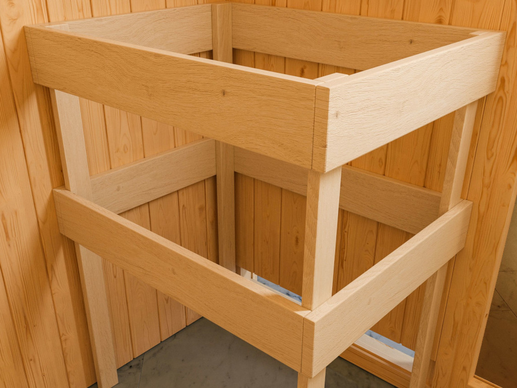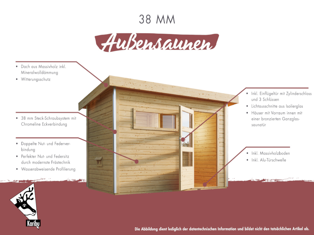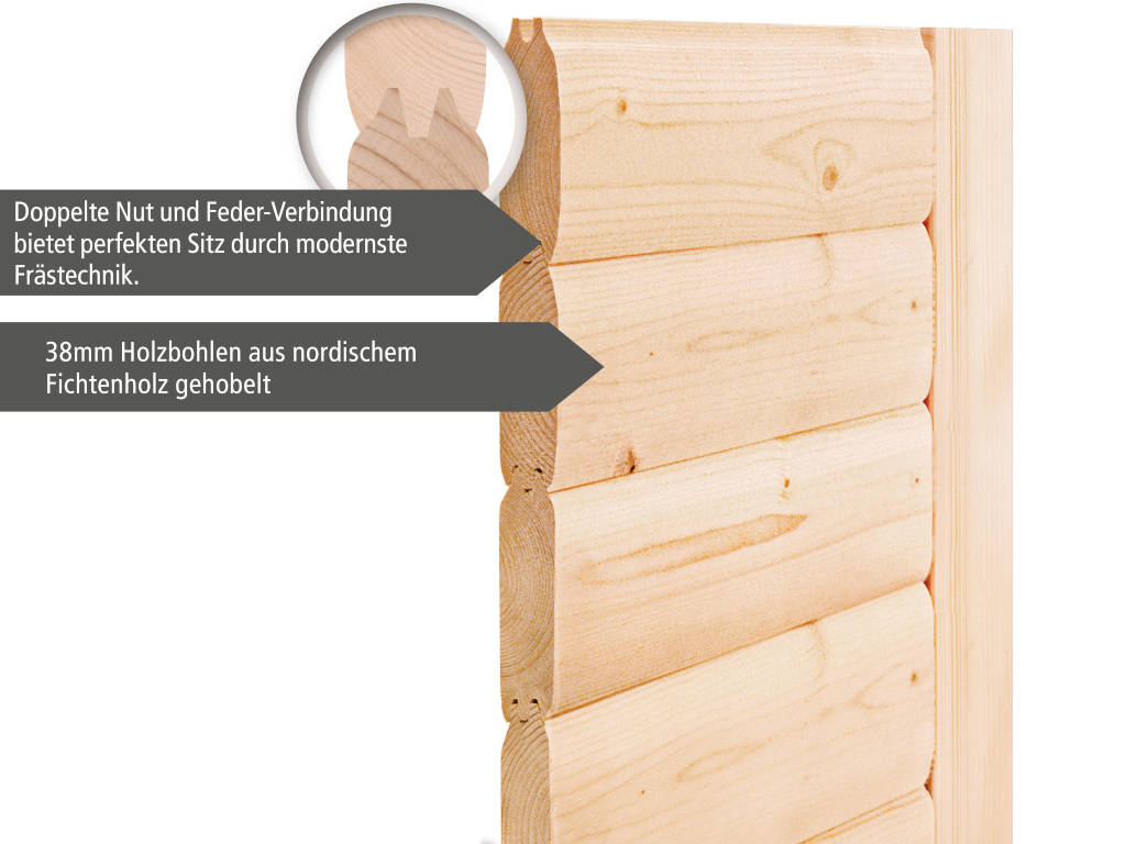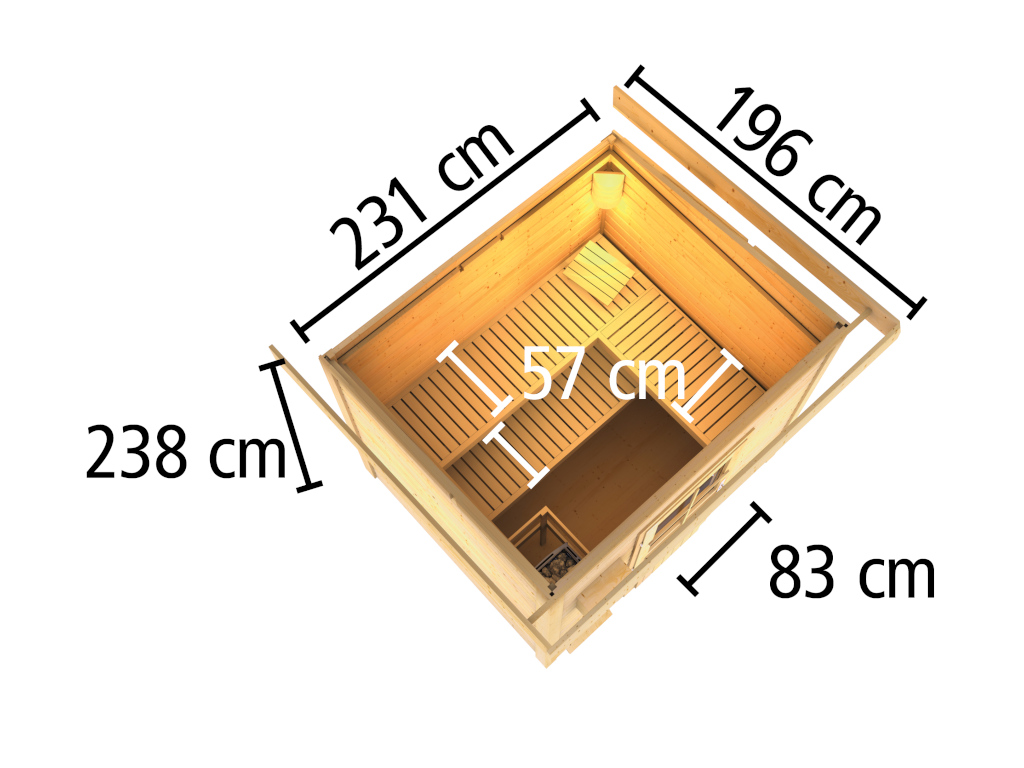 Ce sauna extérieur en excellentes madriers de 38 mm d’épaisseur en épicéa nordique se monte grâce à un système d’emboîtement / vissage. Avec des dimensions totales de 231 cm x 196 cm, il offre suffisamment de place pour profiter de moments de bien-être en toute tranquillité dans votre propre jardin. Le sauna lui-même, avec une surface de 219 cm x 184 cm, est naturellement lui aussi généreusement dimensionné. À l’intérieur, 3 bancs de sauna vous invitent à la détente. Son toit élégant et fonctionnel assure une protection fiable contre les intempéries par le dessus. Des solives de fondation autoclaves garantissent la distance nécessaire par rapport au sol. Les madriers de paroi et les lames à rainure et languette du plancher y sont fixés. Une grille de protection pour le poêle, toutes les vis et ferrures nécessaires ainsi qu’une notice de montage détaillée sont bien entendu incluses.
