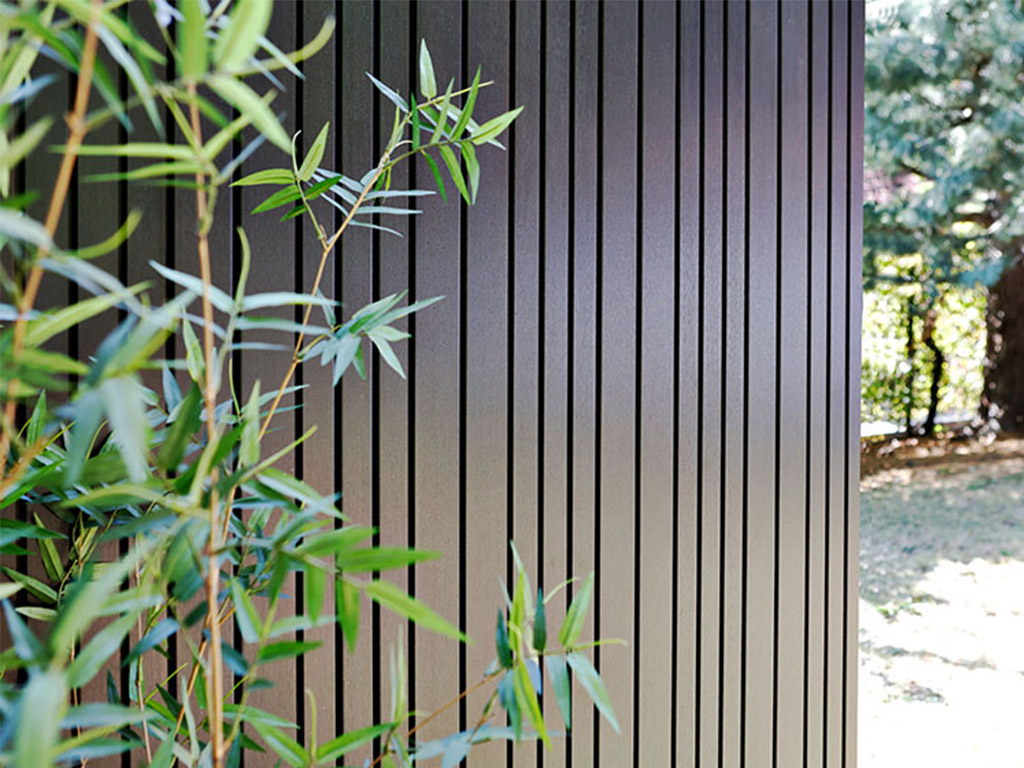 Une lame du bardage Symphony 40 mesure 1860 x 139 x 18 mm. Sa couleur est un brun foncé noble qui s'harmonise visuellement avec le vert des plantes ou le gris des pierres environnantes. Des stries discrètes donnent à la façade un aspect moderne et élégant. Profitez d'une expérience visuelle unique avec le bardage en bambou Symphony.