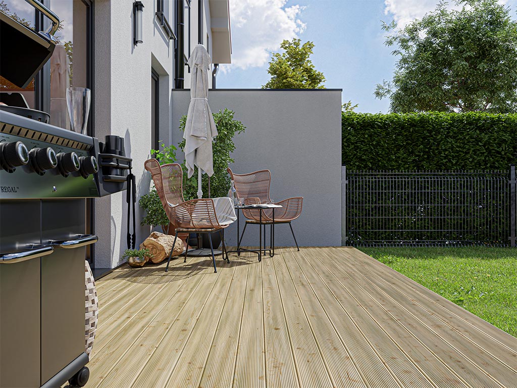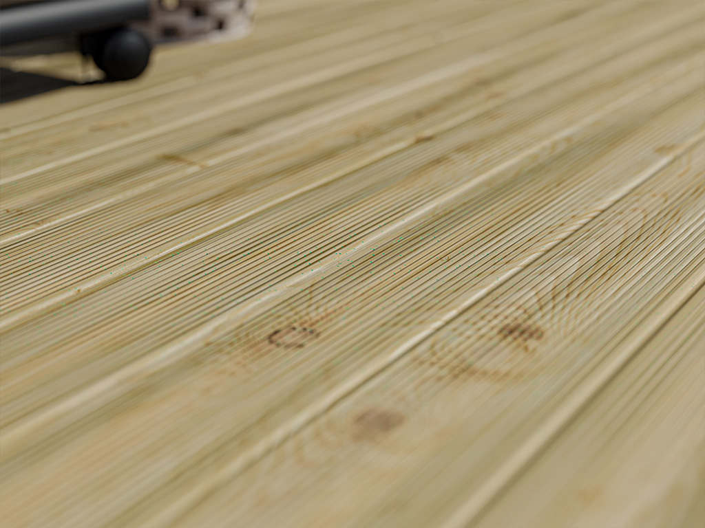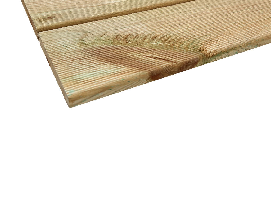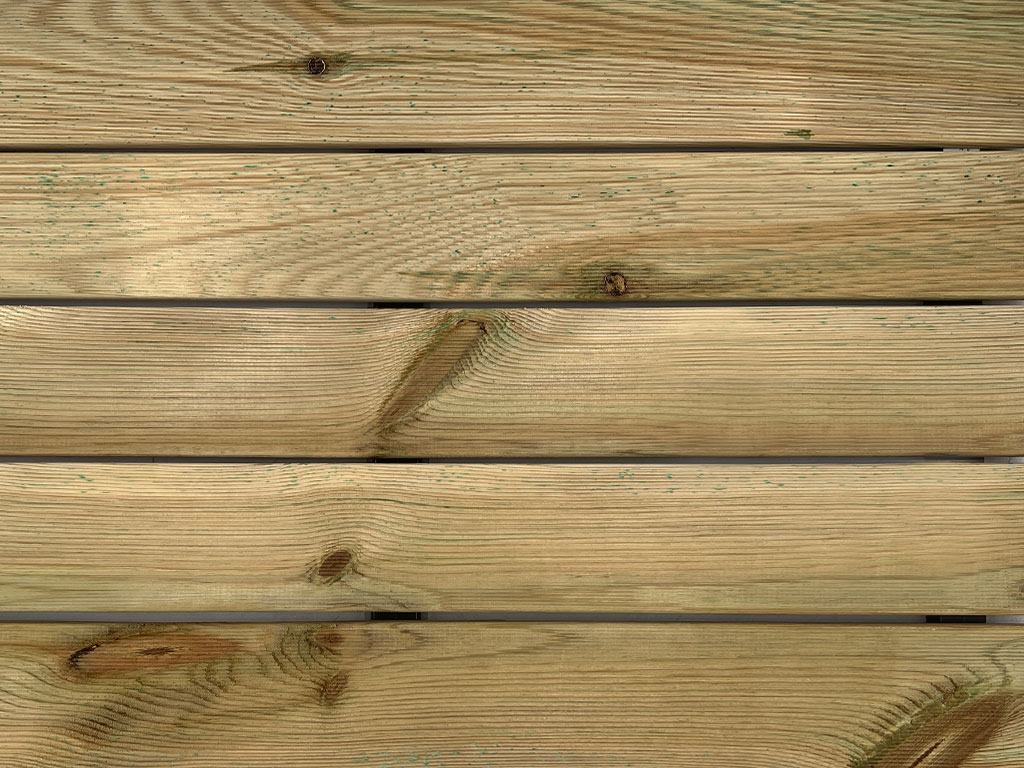 Ces lames sont imprégnées en autoclave (bois KDI). Ce procédé de protection du bois ferme les pores du bois avec des sels contenant du cuivre et le rend plus résistant aux insectes, aux champignons et aux moisissures. Cela permet d'augmenter sa durabilité jusqu'à 10 ans par rapport aux bois non traités. La réaction des résines dans le bois avec les sels peut donner lieu à de petites taches blanches et vertes (les fameuses efflorescences salines). Avec le temps, ils se décolorent sous l'effet des UV. Alternativement, ils peuvent être brossés ou recevoir une finition supplémentaire avec un vernis ou une lasure.