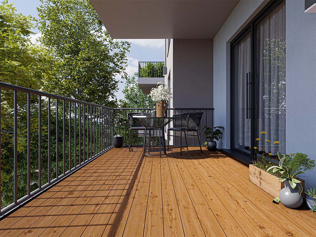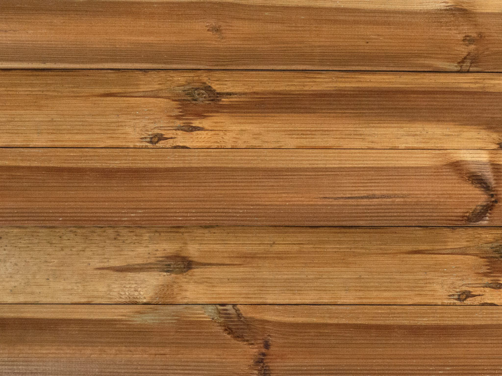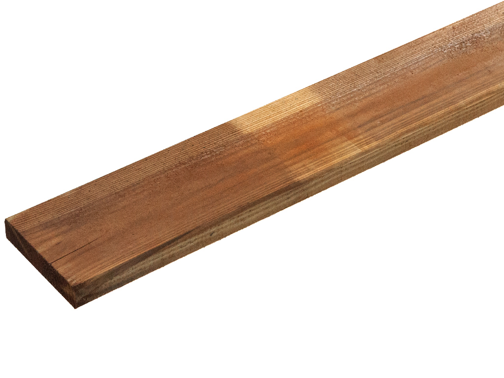 Ces lames sont imprégnées en autoclave (bois KDI). Ce procédé de protection du bois ferme les pores du bois avec des sels contenant du cuivre et le rend plus résistant aux insectes, aux champignons et aux moisissures. Cela permet d'augmenter sa durabilité jusqu'à 10 ans par rapport aux bois non traités. La réaction des résines dans le bois avec les sels peut donner lieu à de petites taches blanches et vertes (les fameuses efflorescences salines). Avec le temps, ils se décolorent sous l'effet des UV. Alternativement, ils peuvent être brossés ou recevoir une finition supplémentaire avec un vernis ou une lasure.