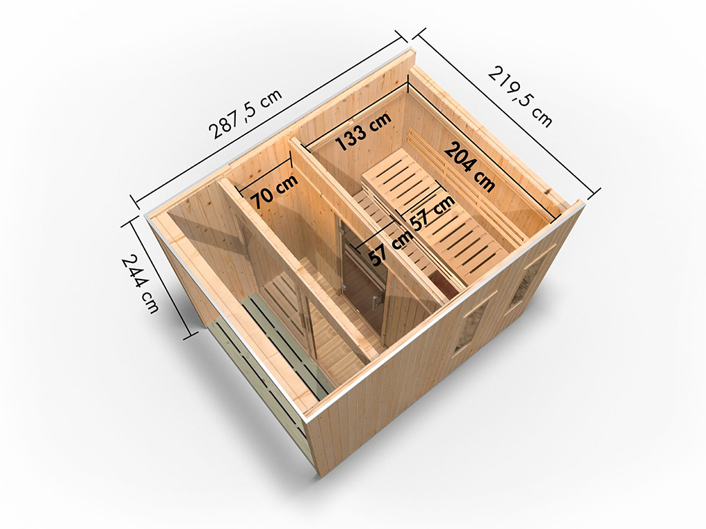 | Dimensions extérieures avec débord de toit (l x P): | 219,5 x 357,5 cm |