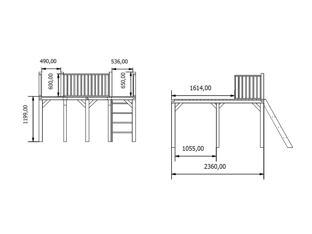Dimensions (L x P x H) : 248 x 322 x 359 cm, avec véranda + mezzanine, plateforme de 120 cm avec toboggan