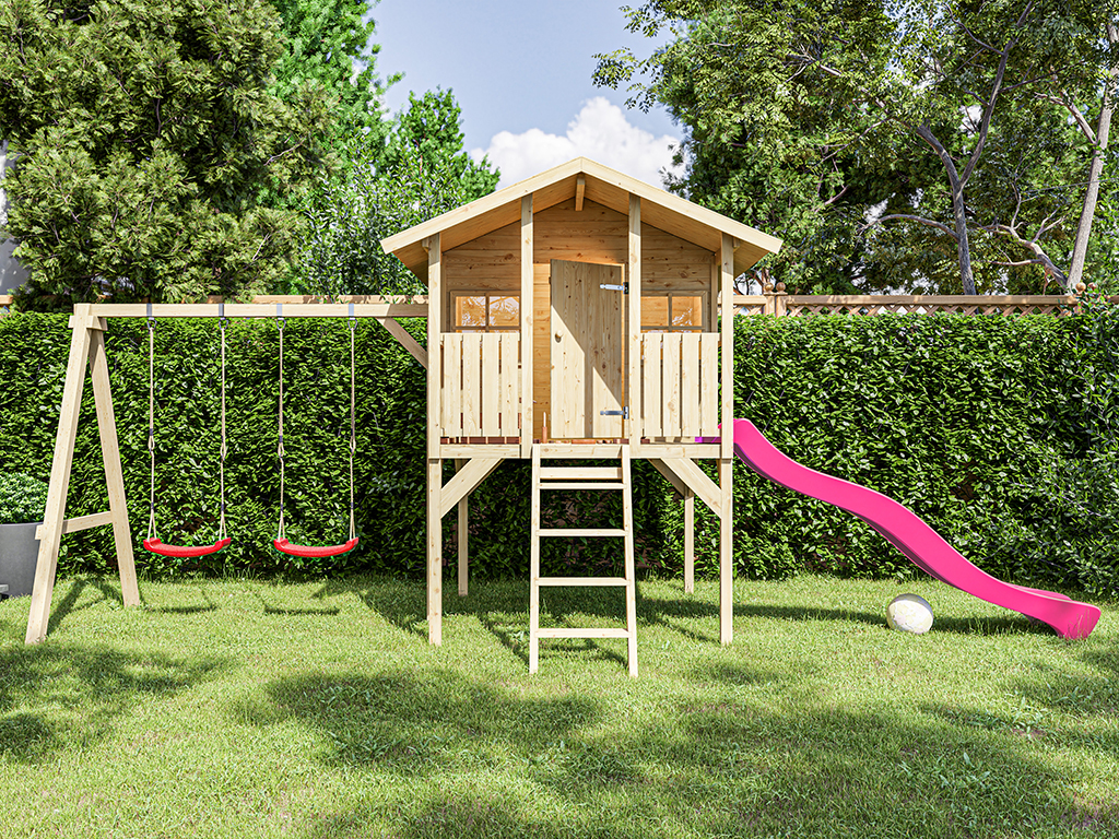 Cabane sur pilotis en bois autoclave “Toby” avec portique double et toboggan rose