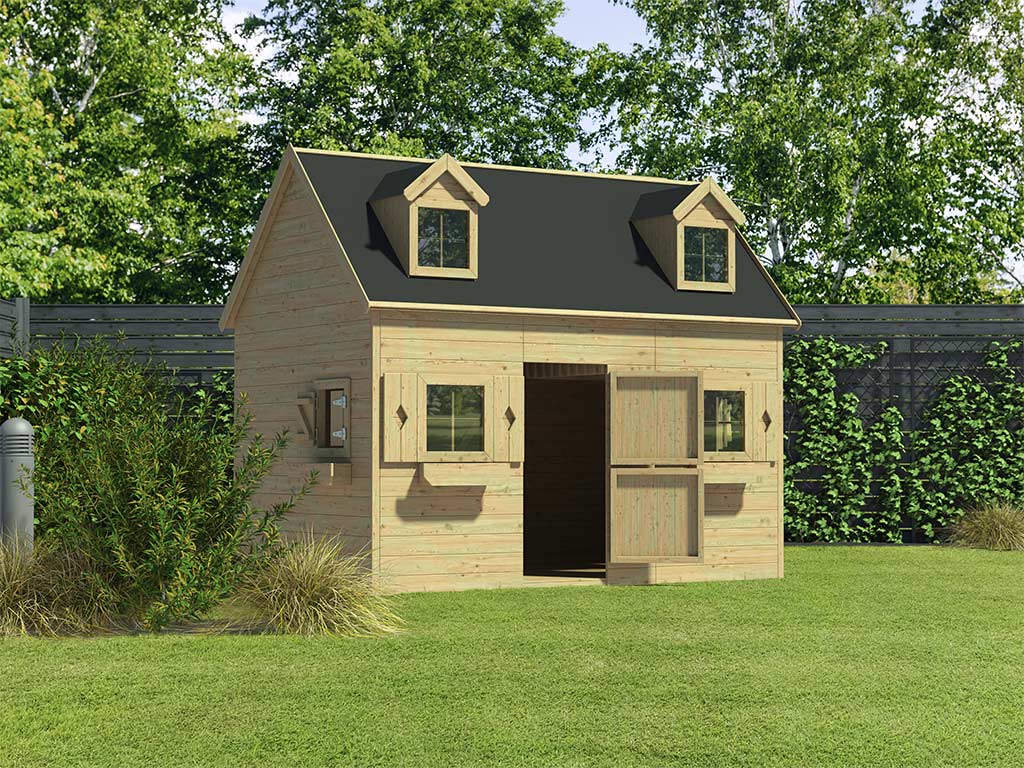 La structure de base est en bois profilé imprégné en autoclave, ce qui la rend particulièrement résistante aux intempéries. Après séchage complet, la maisonnette peut être peinte selon vos envies. Nous recommandons une peinture de protection du bois à pores ouverts et à haute pigmentation. - Plancher inclus
