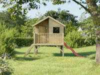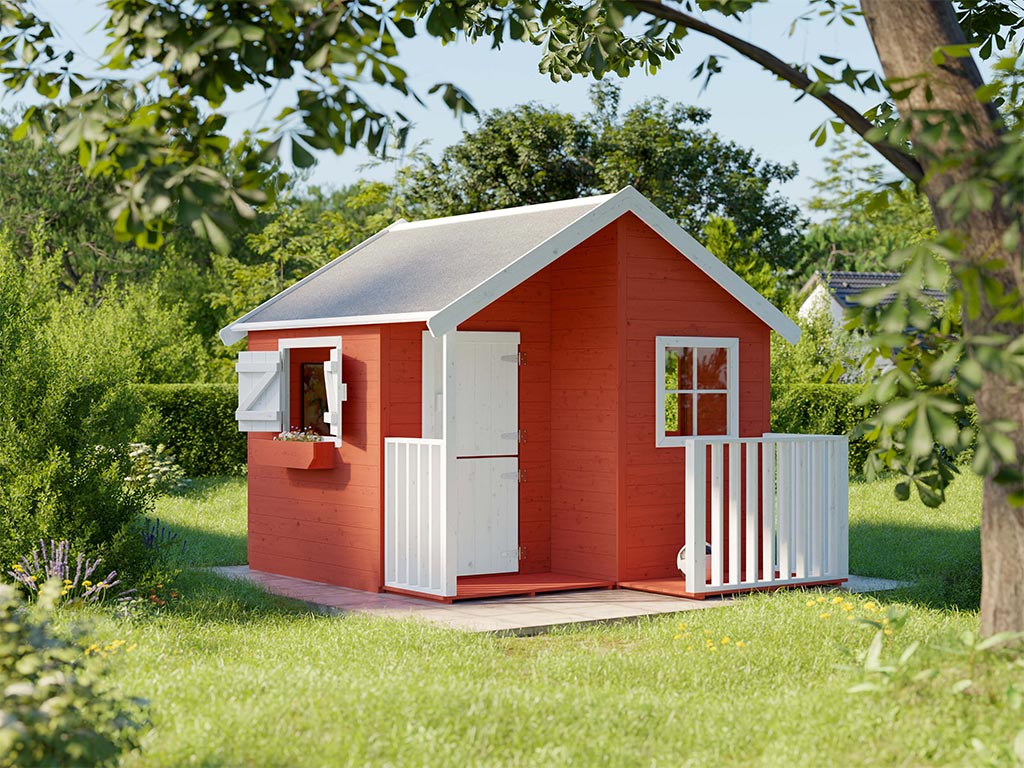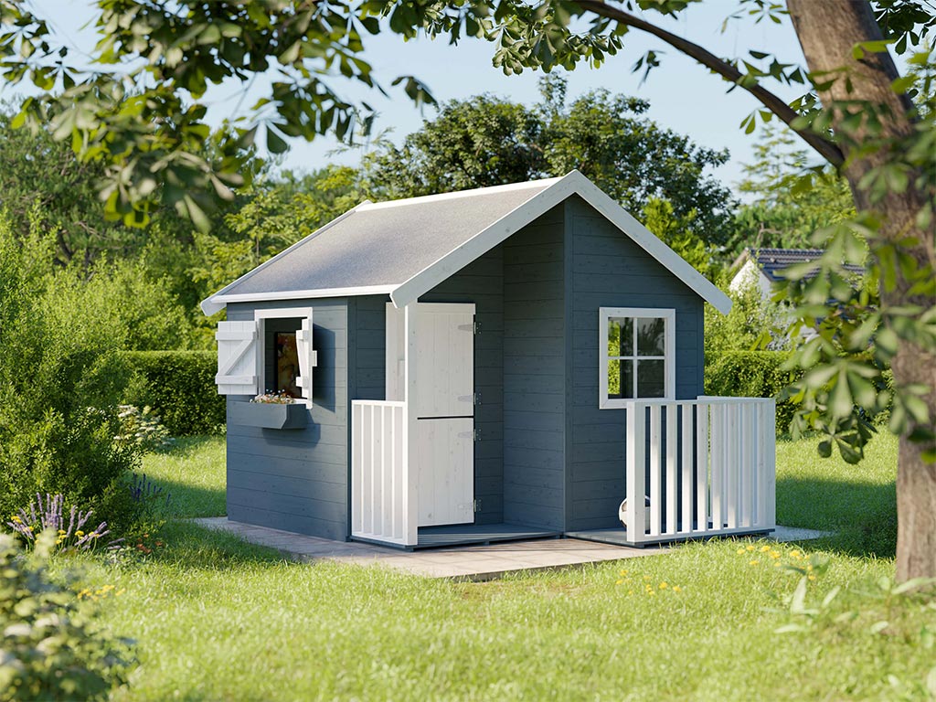 La maisonnette avec véranda est livrée avec une porte simple et 3 fenêtres et garantit un grand plaisir de jeu pour les enfants.