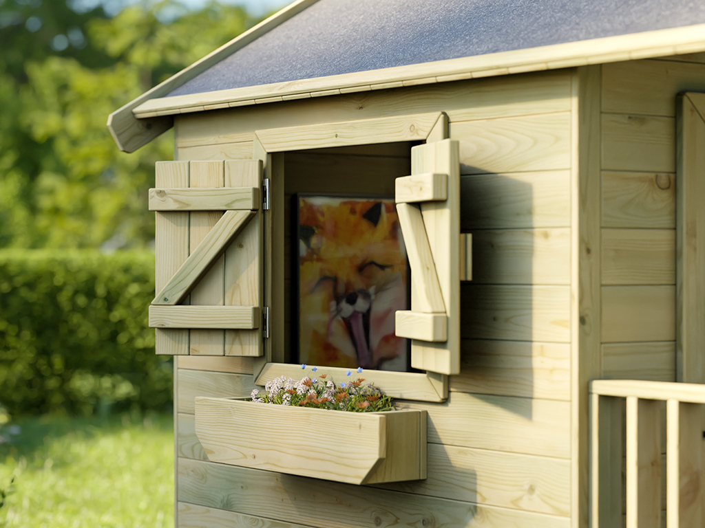 La porte unique en deux parties et les trois fenêtres apportent beaucoup de lumière à l'intérieur de cette belle maisonnette de jeu pour enfants. La fenêtre à l'avant est équipée d'un insert en verre synthétique. Les deux fenêtres dans les parois latérales sont livrées avec des bacs à fleurs et des volets qui permettent de les fermer. La fenêtre et la porte en bois sont toutes deux équipées d'un dispositif anti-pince-doigts (espace entre la fenêtre/porte et le mur de la maison). - Avec plancher et beaucoup d'espace