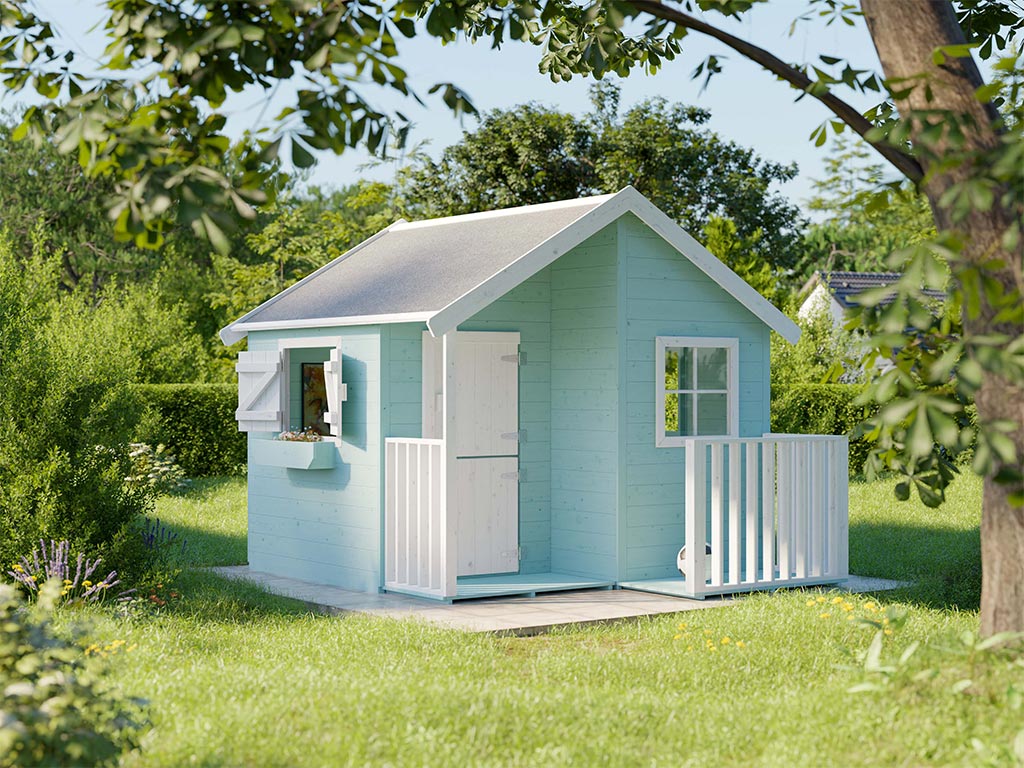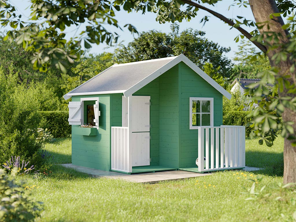 La maisonnette avec véranda est livrée avec une porte simple et 3 fenêtres et garantit un grand plaisir de jeu pour les enfants.
