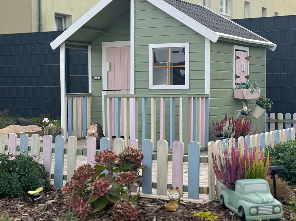 La maisonnette peut être complétée par de nombreux accessoires, tels qu'une boîte aux lettres, un téléphone de jeu ou un volant, selon les souhaits de vos enfants. Dans tous les cas, nous vous recommandons de recouvrir le toit de bardeaux fonctionnels et décoratifs. Consultez notre large gamme d'accessoires. - Montage simple et rapide