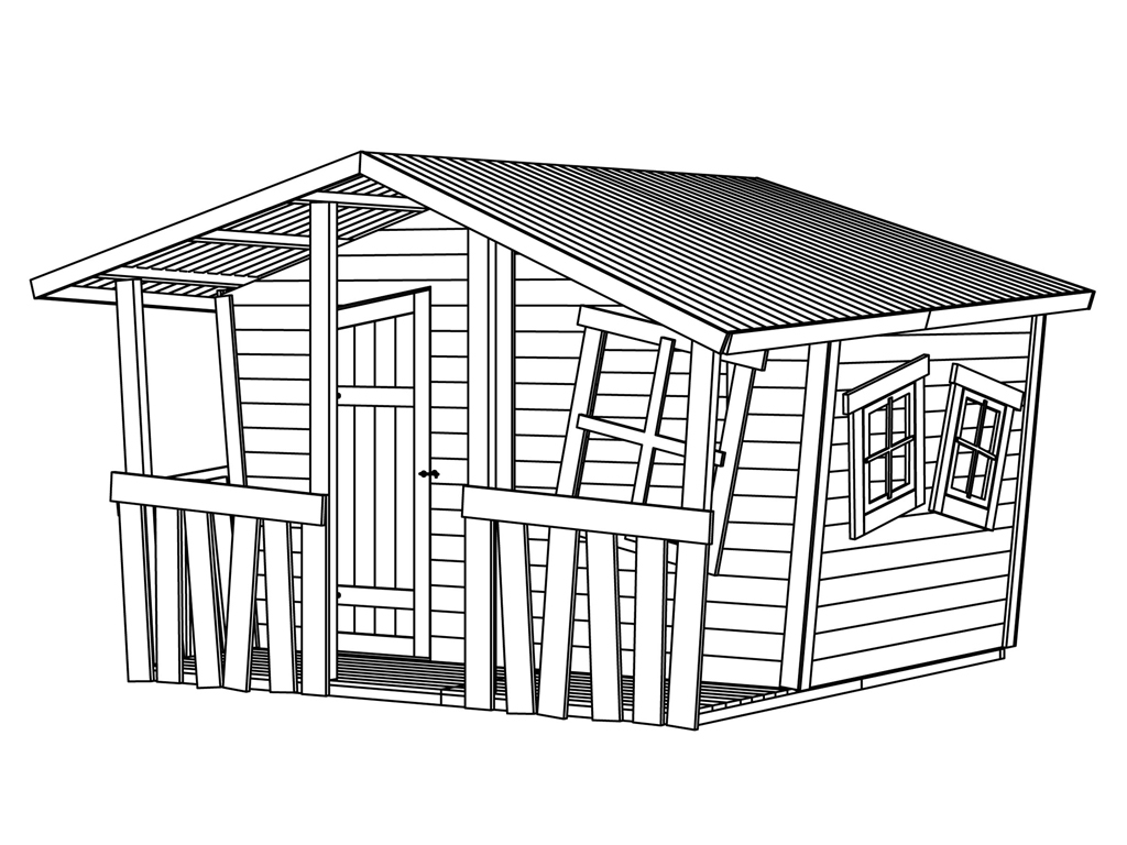 Veuillez noter que l'installation et la peinture de cette cabane doivent être effectuées uniquement par temps favorable : températures supérieures à +5 °C pendant plusieurs jours consécutifs et humidité relative inférieure à 80 %. Dans le cas contraire, le bois de votre cabane pourrait se déformer.