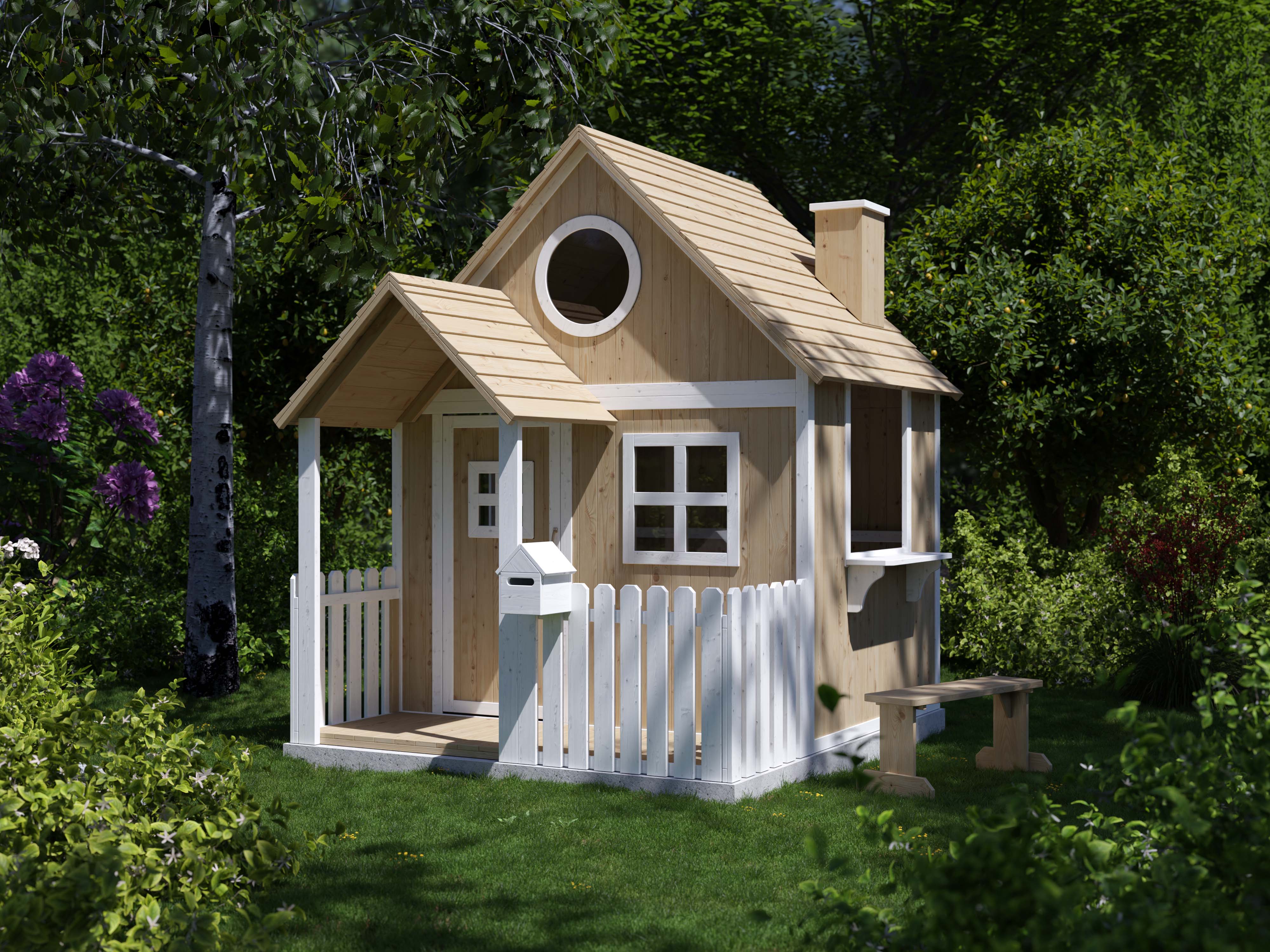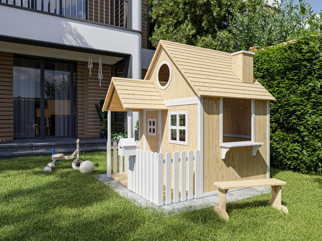 Cette cabane offre à vos enfants des expériences uniques dans leur propre espace de jeu. Elle est livrée avec une véranda, une boîte aux lettres et un comptoir de vente avec banc inclus. - Montage simple et rapide