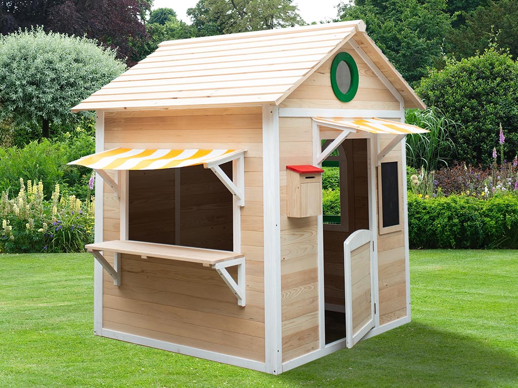 La maisonnette est équipée d'une fenêtre de vente ouverte, y compris un comptoir. Les toits en film jaune/blanc sur la fenêtre de vente et la porte renforcent le caractère de l'étalage. L'autre paroi latérale comporte une fenêtre ouvrante (verre synthétique). Dans la façade, au-dessus de la porte, se trouve une fenêtre ronde fixe (verre synthétique). - Boîte aux lettres, tableau à craies et bac à fleurs inclus.