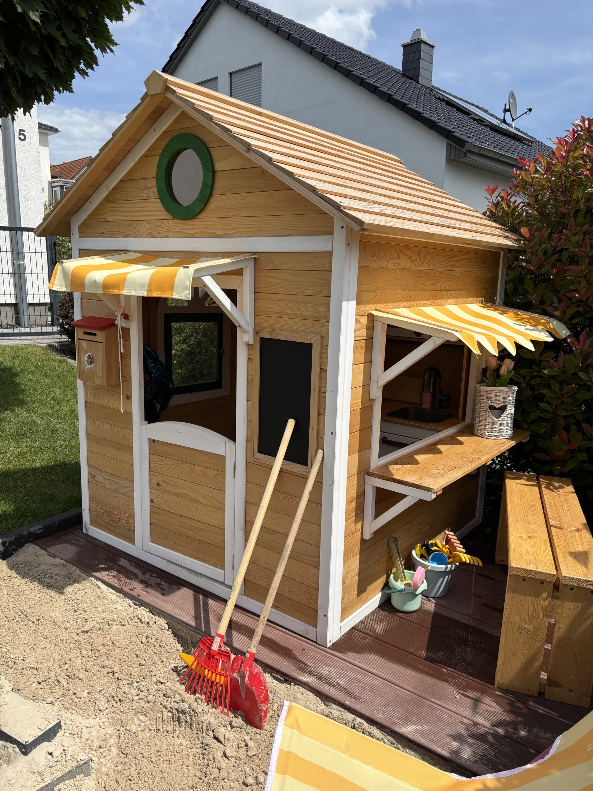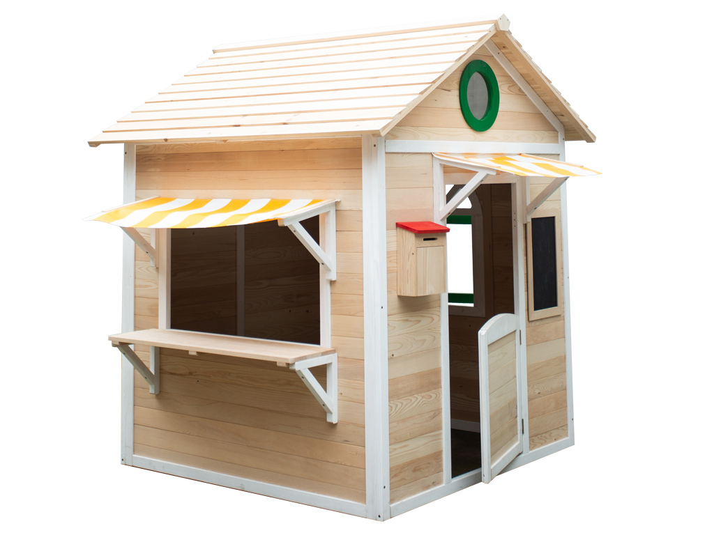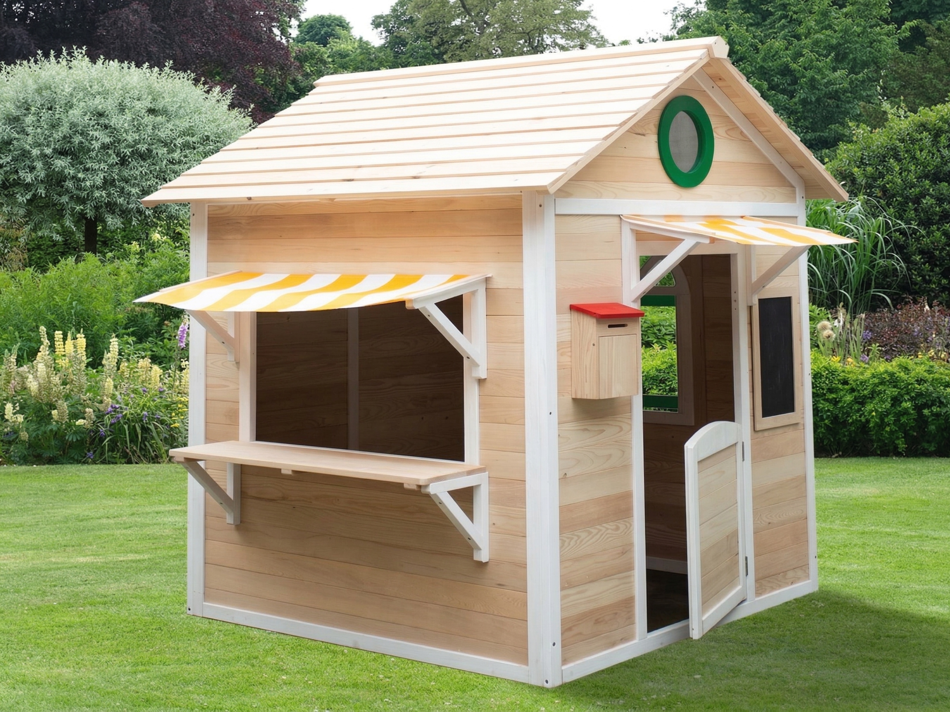 La maisonnette est équipée d'une fenêtre de vente ouverte, y compris un comptoir. Les toits en film jaune/blanc sur la fenêtre de vente et la porte renforcent le caractère de l'étalage. L'autre paroi latérale comporte une fenêtre ouvrante (verre synthétique). Dans la façade, au-dessus de la porte, se trouve une fenêtre ronde fixe (verre synthétique). - Boîte aux lettres, tableau à craies et bac à fleurs inclus.