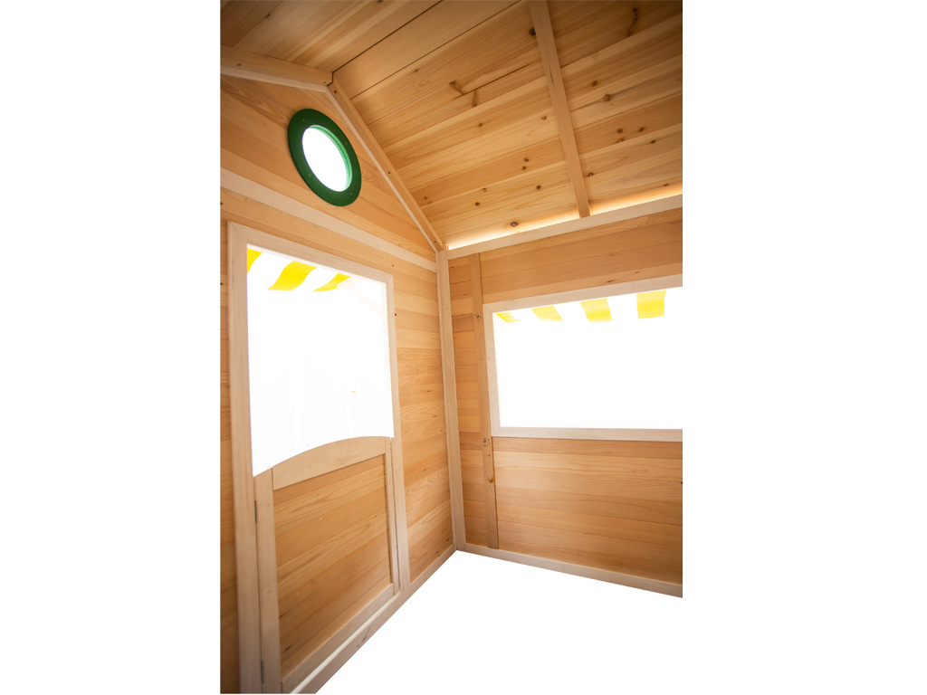 La maisonnette en bois de cèdre asiatique est livrée déjà prétraitée en blanc, vert et transparent (1 couche). La maisonnette doit cependant être peinte rapidement - de préférence avant le montage - avec une autre couche de lasure transparente de protection du bois. Pour profiter longtemps de la maisonnette, il est recommandé de la repeindre une fois par an.