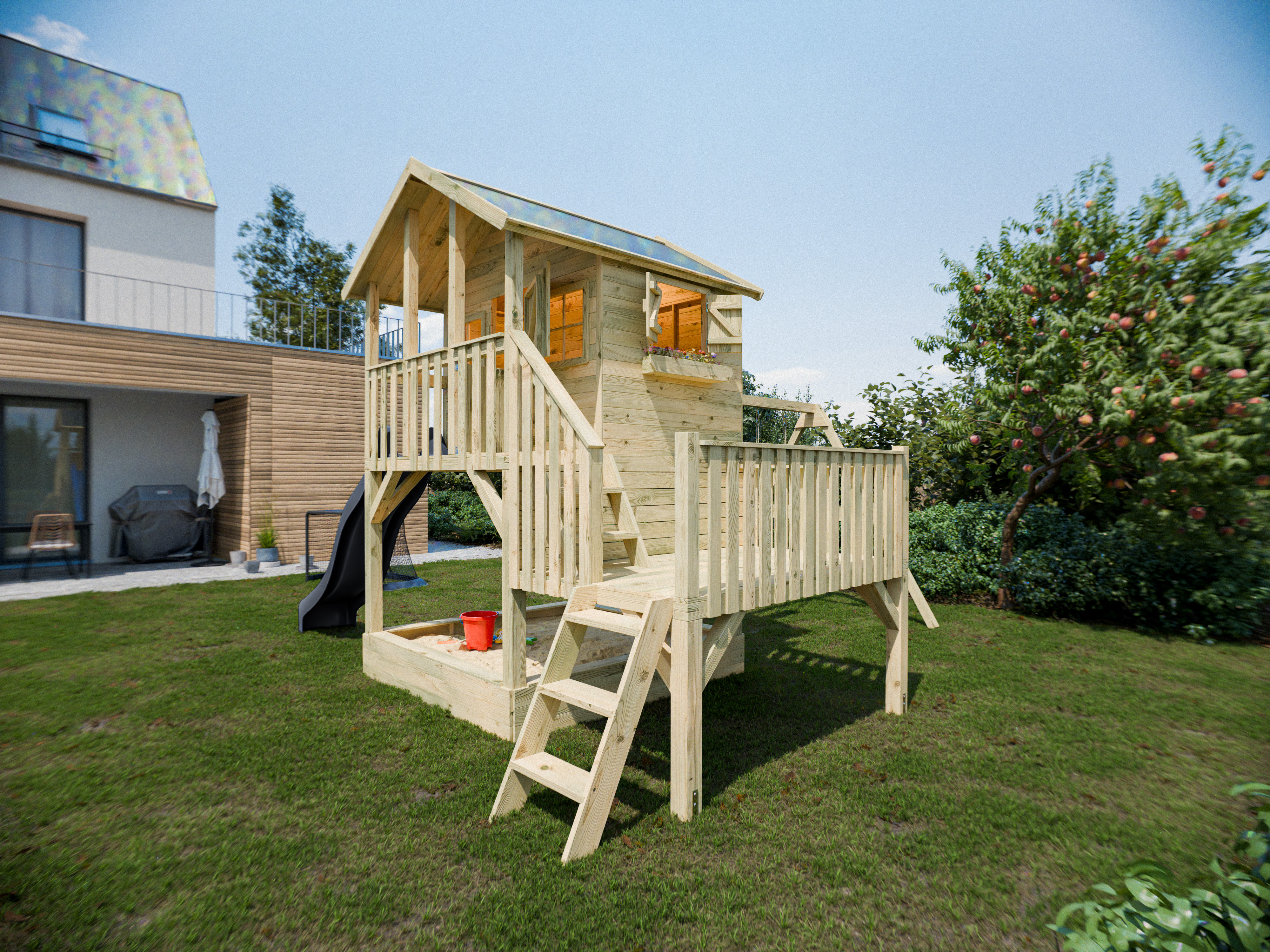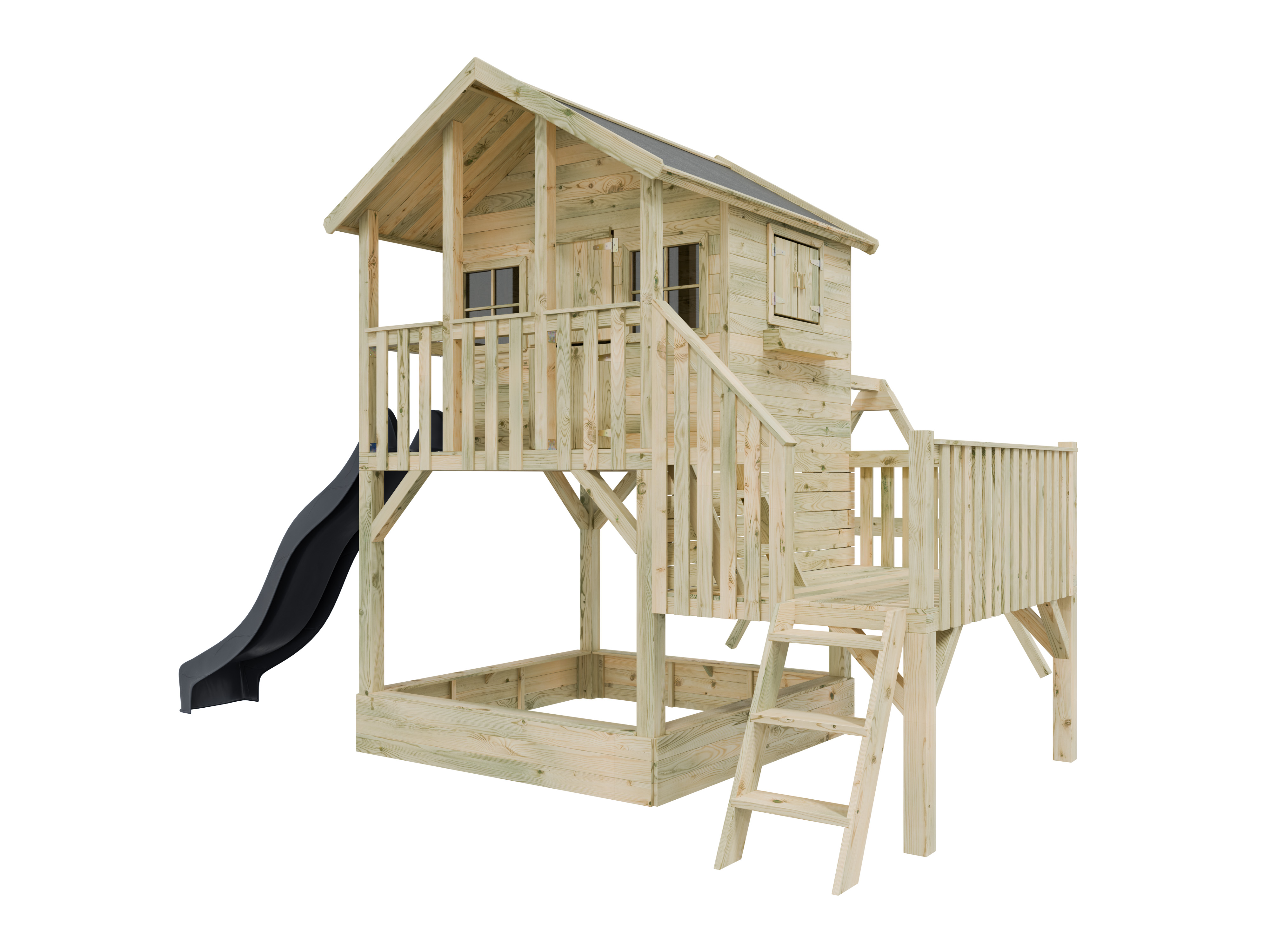 Cette cabane sur pilotis avec une véranda spacieuse est dotée d'une fenêtre à ouverture extérieure avec volets sur le côté et de deux fenêtres fixes en acrylique à l'avant. Une jardinière est également incluse. La cabane offre suffisamment d'espace pour plusieurs enfants et peut être agrandie selon leurs envies, par exemple avec une cuisine miniature. - Bac à sable inclus